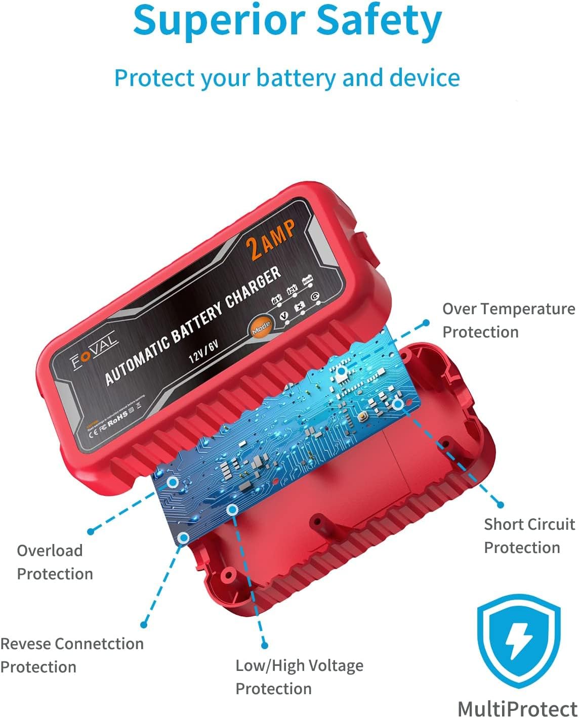 [2-Pack] FOVAL 2-Amp Car Battery Charger, 6V and 12V Portable Automatic Smart Charger, Battery Maintainer, Trickle Charger and Battery Desulfator for Car Lawn Mower Motorcycle Boat Lead Acid Batteries