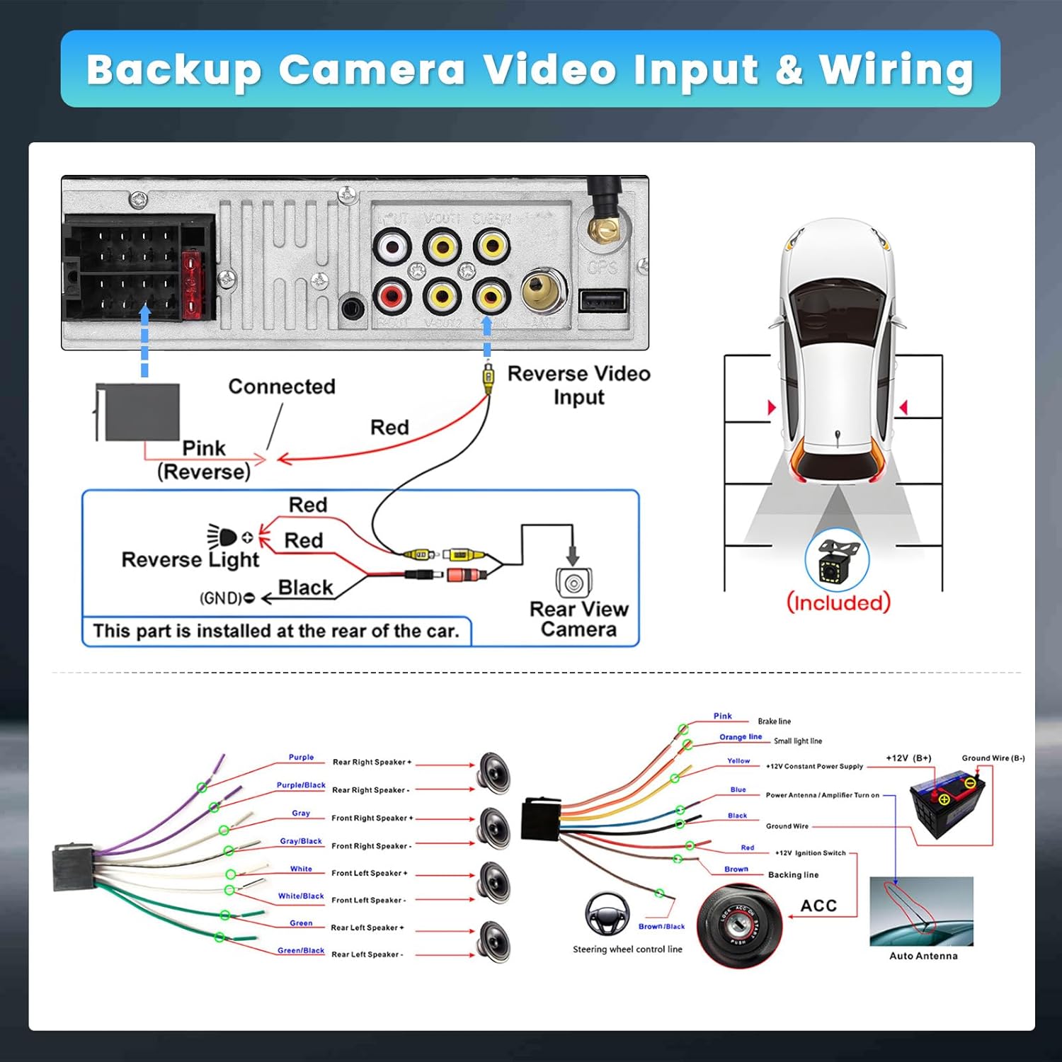 - ăHD Backup Camera & Steering Wheel ControlsăEquipped with a 170° viewing angle HD waterproof backup camera, the single din car head unit automatically displays a clear image when reversing. Steering wheel functions are programmed to work flawlessly, allowing you to focus on driving for increased safety and convenience