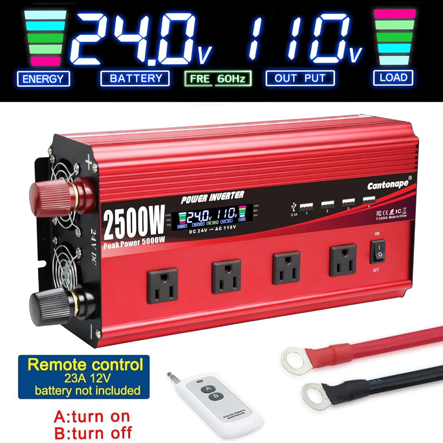 2500W Power Inverter 24V to 110V/120V DC to AC with LCD Display, Remote Controller 4 x AC Outlets and 4 x 3.1A USB Car Adapter for Car Truck Boat RV Solar System