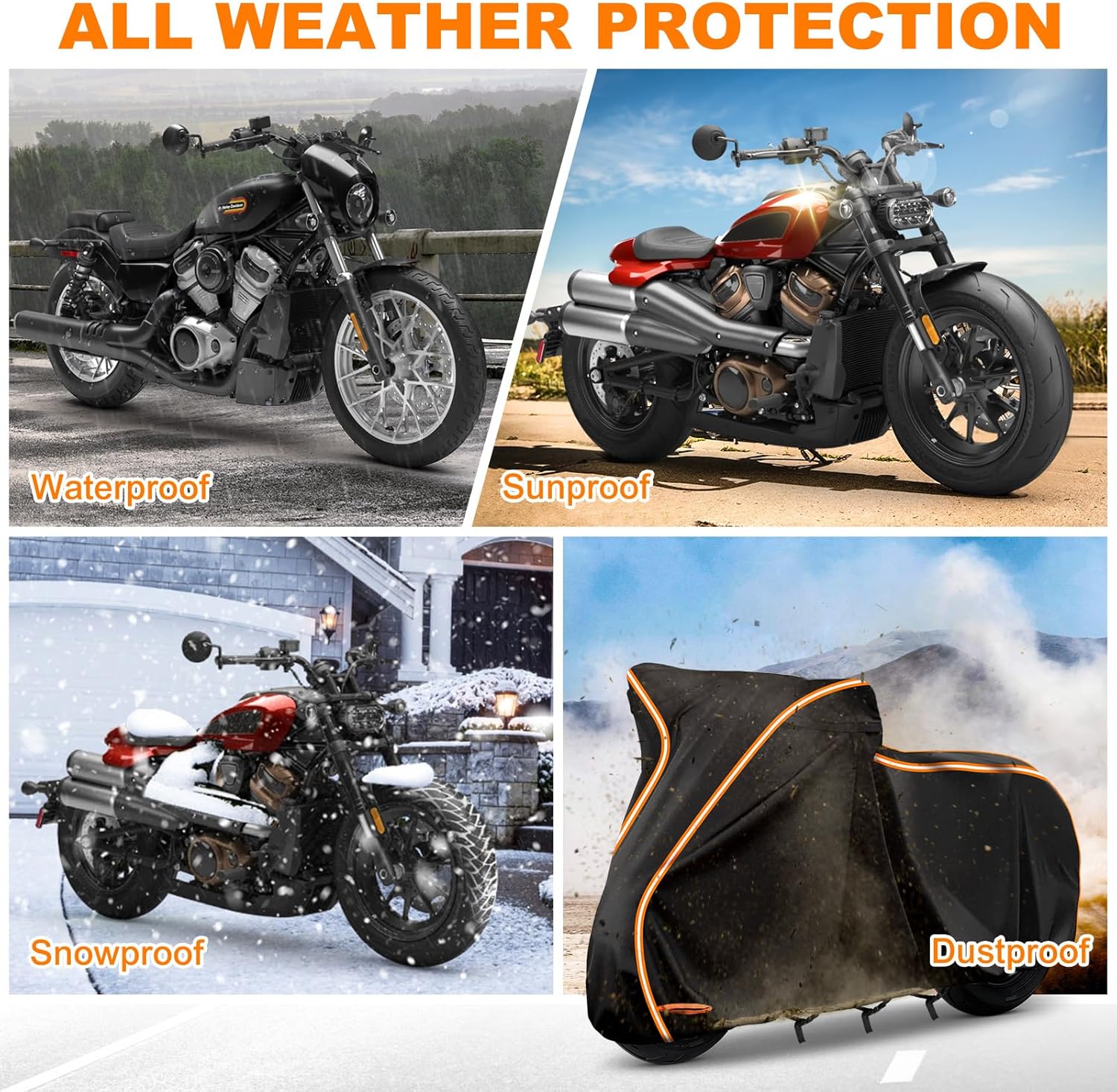 - ăHeat InsulationăAdd heat insulation cotton layer to the position of the exhaust pipe to prevent the cover from melting. This motorcycle cover is made of premium Oxford Fabric. Preserve your Vehicle and Paint Against All Rain,Pollen,Snow,Sun,Bird Droppings,Dust/Dirt - Approved for All Season Use. For a long-time use,it is best to put the cover back on after the engine has cooled.
