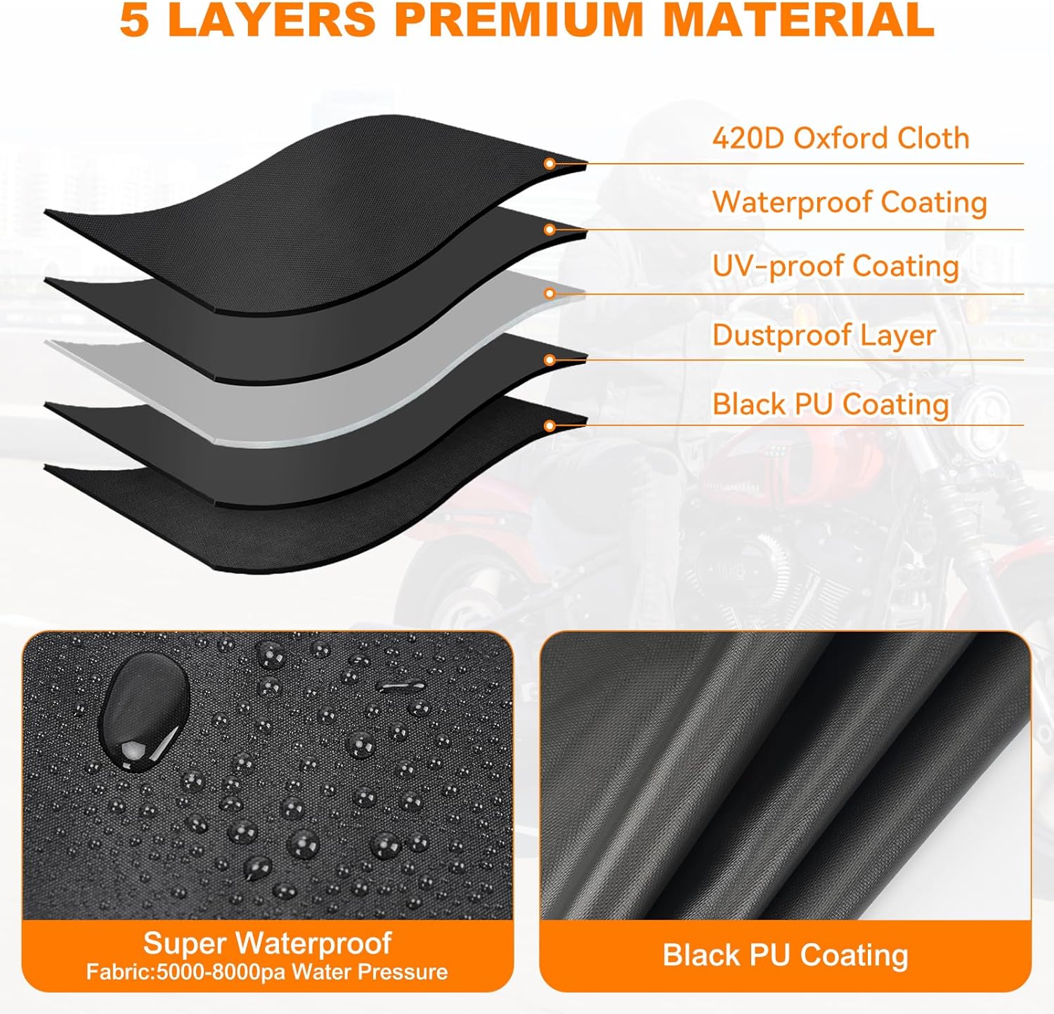 - ăWHAT IS THE MATERIALSăThe motorcycle covers are made from greater 420D Oxford Fabric. which are printed with PU coating. In other words, compared with others, we provide higher density textiles and better elasticity, so the cover are durable enough and fairly thick.There is also a significant increase in water resistance, with a maximum of up to 8,000 Pa of water pressure.