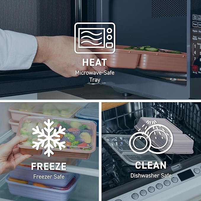 - Easy to Heat & Clean: Safely heat up your food straight from the freezer or refrigerator for warm, delicious meals and leftovers. Each meal prep container is both microwave and top-shelf dishwasher safe. Note: do not microwave lids, only the trays are microwavable. For best results, hand wash to extend the life of the product.
