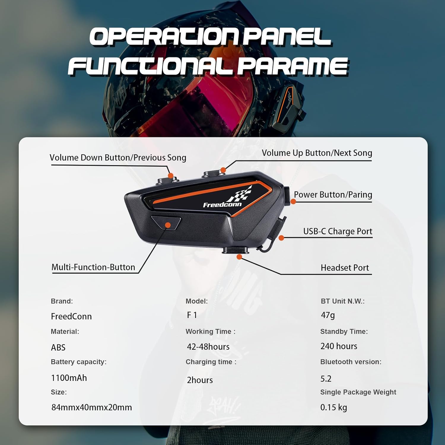 - 【Ultimate Music Journey】The FreedConn F1 motorcycle helmet Bluetooth headset is powered by a robust 1100mAh battery, offering up to 48 hours of music playback, and 50 hours talk time. Enjoy uninterrupted music and calls on the go with this reliable motorcycle helmet bluetooth headset