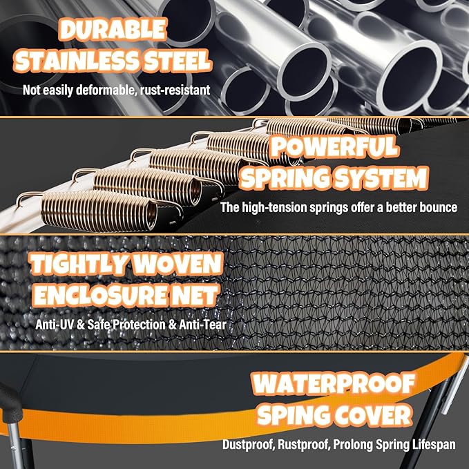 - 【Gapless & Tightly-woven Enclosure】To enhance safety and durability, the 12 feet trampoline features a gapless design, minimizing the risk of accidental injuries by ensuring a seamless and secure bounce area. The enclosure is crafted from tightly-woven polyethylene, offering robust UV protection.