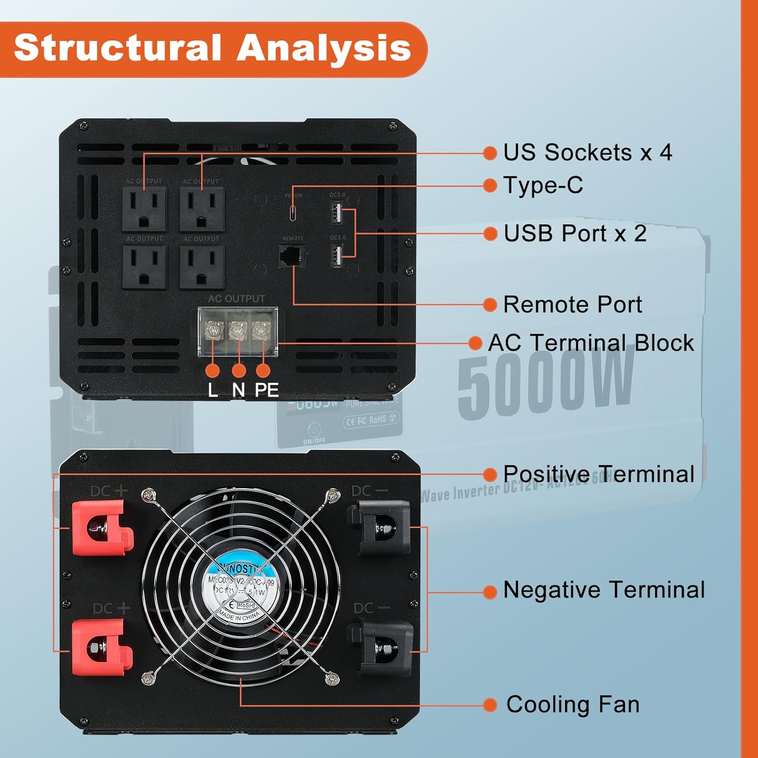 - Widely Application: The pure sine inverter 5000w powers sensitive electronic devices and appliances, such as laptop, smartphones, TVs, power tools, toaster, coffee machine, heater etc. It features with 4 AC outlets, 1 hardwire port, dual USB QC3.0 18W, Type C PD30W for versatile use.