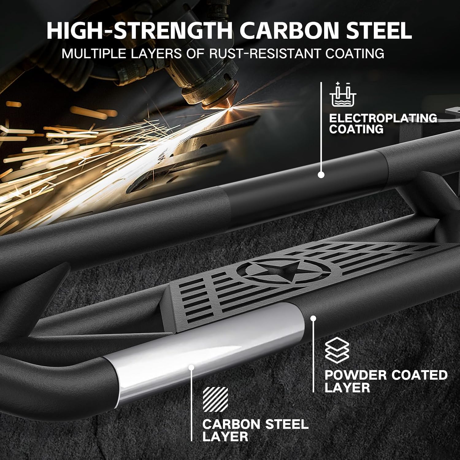 - ăStylish Designă: Featuring a step-style design with a drop height of approximately 5 inches. The rugged off-road look is complemented by a stylish design, enhancing the appearance of your wrangler JL.