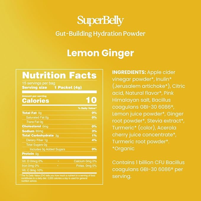 Blume New SuperBelly Gut Health and On-The-Go Hydration Packets, Sugar-Free, with Prebiotics, Probiotics, Apple Cider Vinegar, Vitamin C, and Electrolytes, Lemon Ginger, 15 Sticks