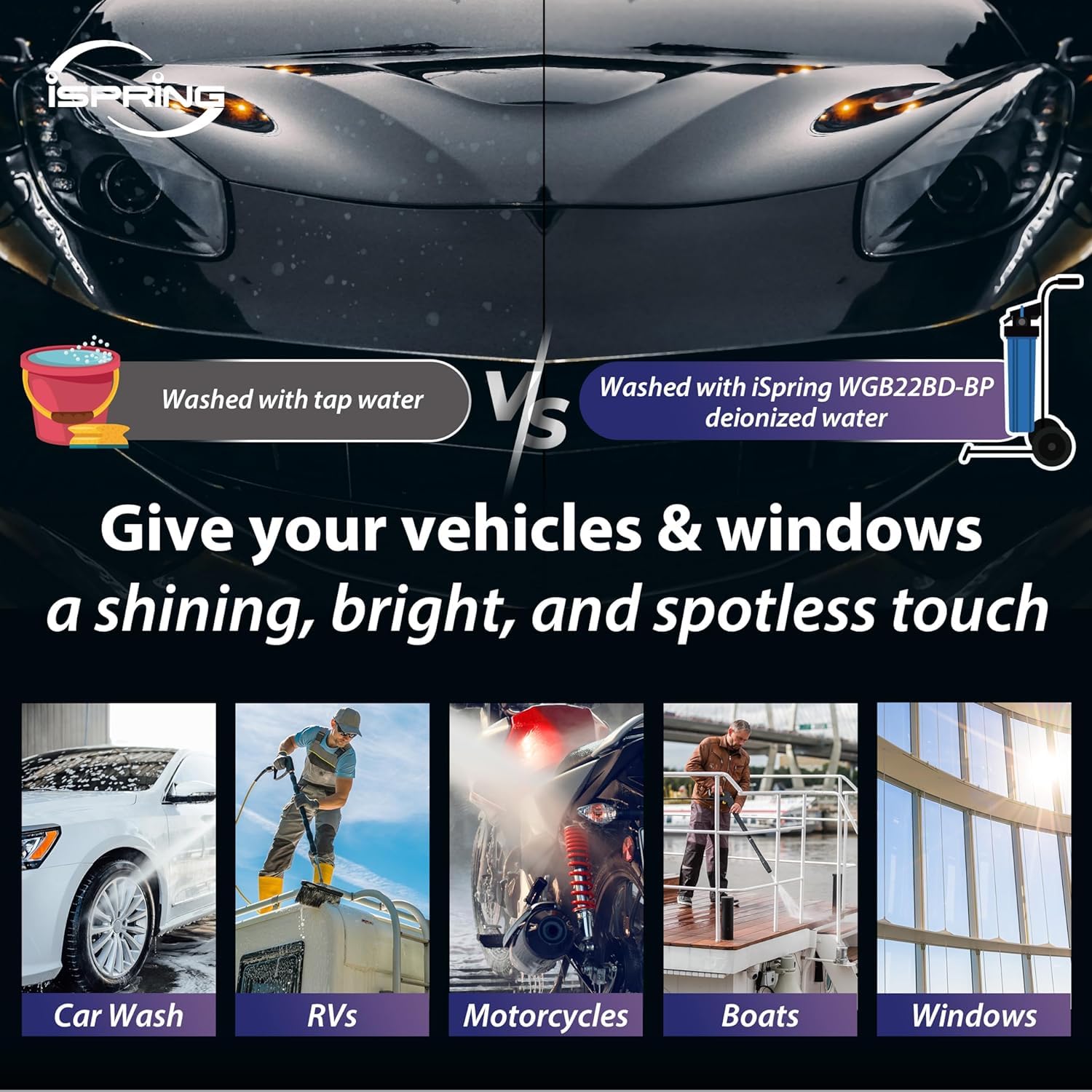 - π Advanced Car Wash Solution: Experience a pristine car wash system that delivers filtered water with minimal to zero Total Dissolved Solids (TDS). The iSpring new WGB22BD-BP deionized water system is ideal for giving cars, RVs, boats, motorcycles, windows, and more a brilliant, spotless finish.
