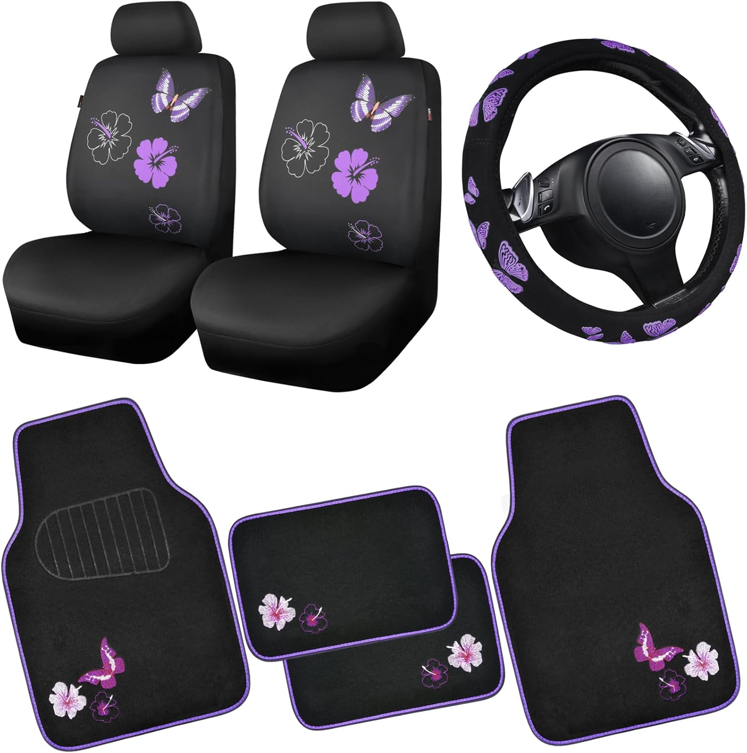 - 【Complete Car Interior Accessories】Includes 2 front set of butterfly seat covers, 4 butterfly floor mats and a butterfly steering wheel cover to give your car a new look.