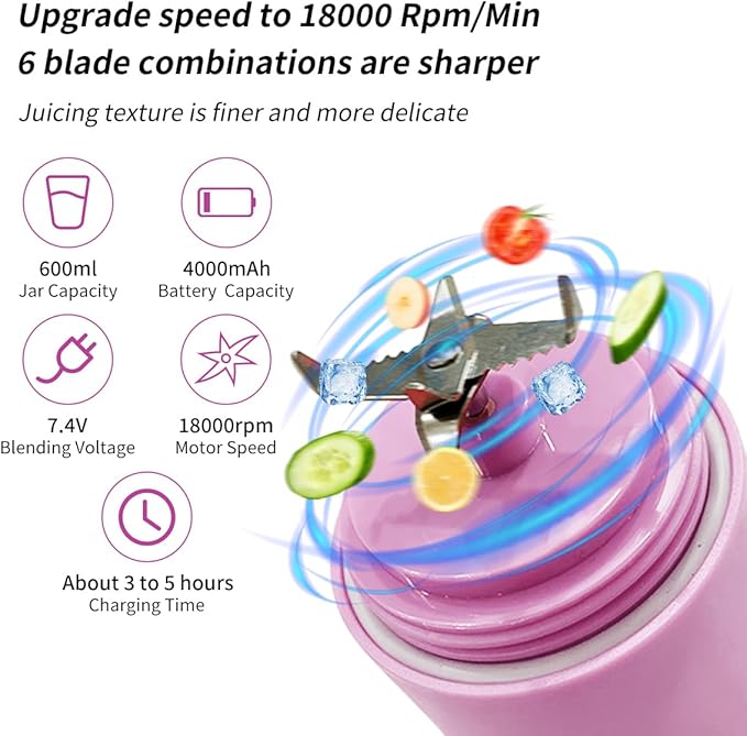 - 【High Speed & Larger Capacity Blender】Our portable blender adopts 270W powerful motor allows your single blender for shakes and smoothies. Low working noise, 20oz (600ml) large-capacity personal blender allows you to make as many delicious drinks as possible at one time. A one-button action, 6 stainless blade which can easily and quickly crush ice cubes, mash vegetables and fruits to make delicious drinks only 30 seconds.