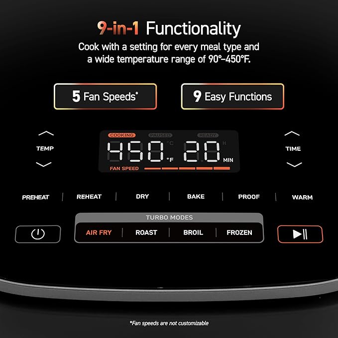 - Product 1: 9-in-1 Versatility: With a 9-in-1 functionality, it includes Air Fry, Roast, Bake, Broil, Dehydrate, Frozen, Proof, Reheat, and Keep Warm, providing versatile options for all your culinary needs.