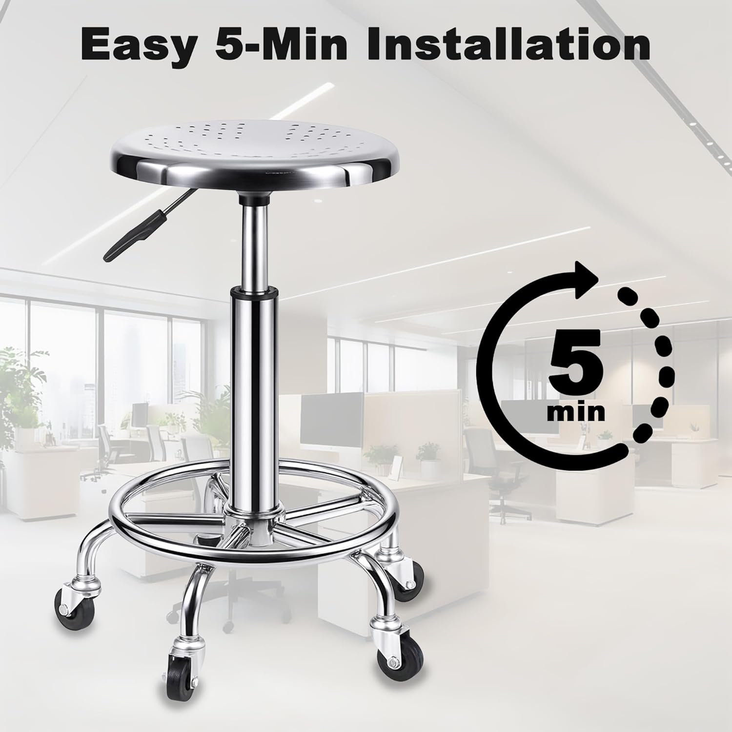 - 360 Degree Swivel - Slides effortlessly on adjustable gas-lift, 360 degree rotation w/5 rolling caster wheels for optimal angle without moving the stool, smooth-rolling for safety