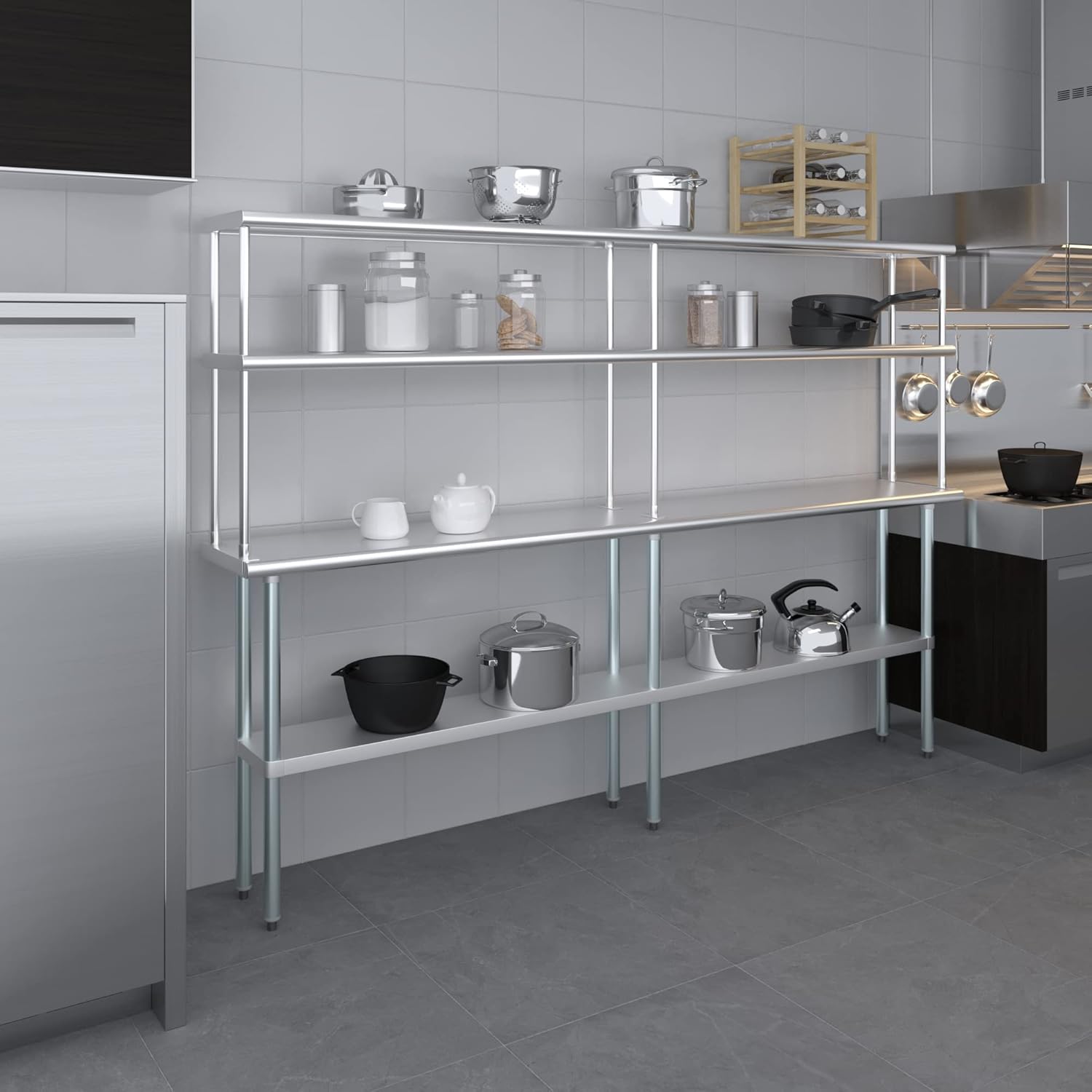 - WORK SAFETY: Work table top and double tier adjustable shelves are constructed from 18-gauge stainless steel, making this restaurant prep and serve table and double tier shelf combo set is durable and long lasting. The table top comes with a galvanized under-shelf for additional storage and adjustable legs for convenience. This table and shelf set is specifically designed and finished for use in a commercial or industrial setting, but is just as reliable in the home.