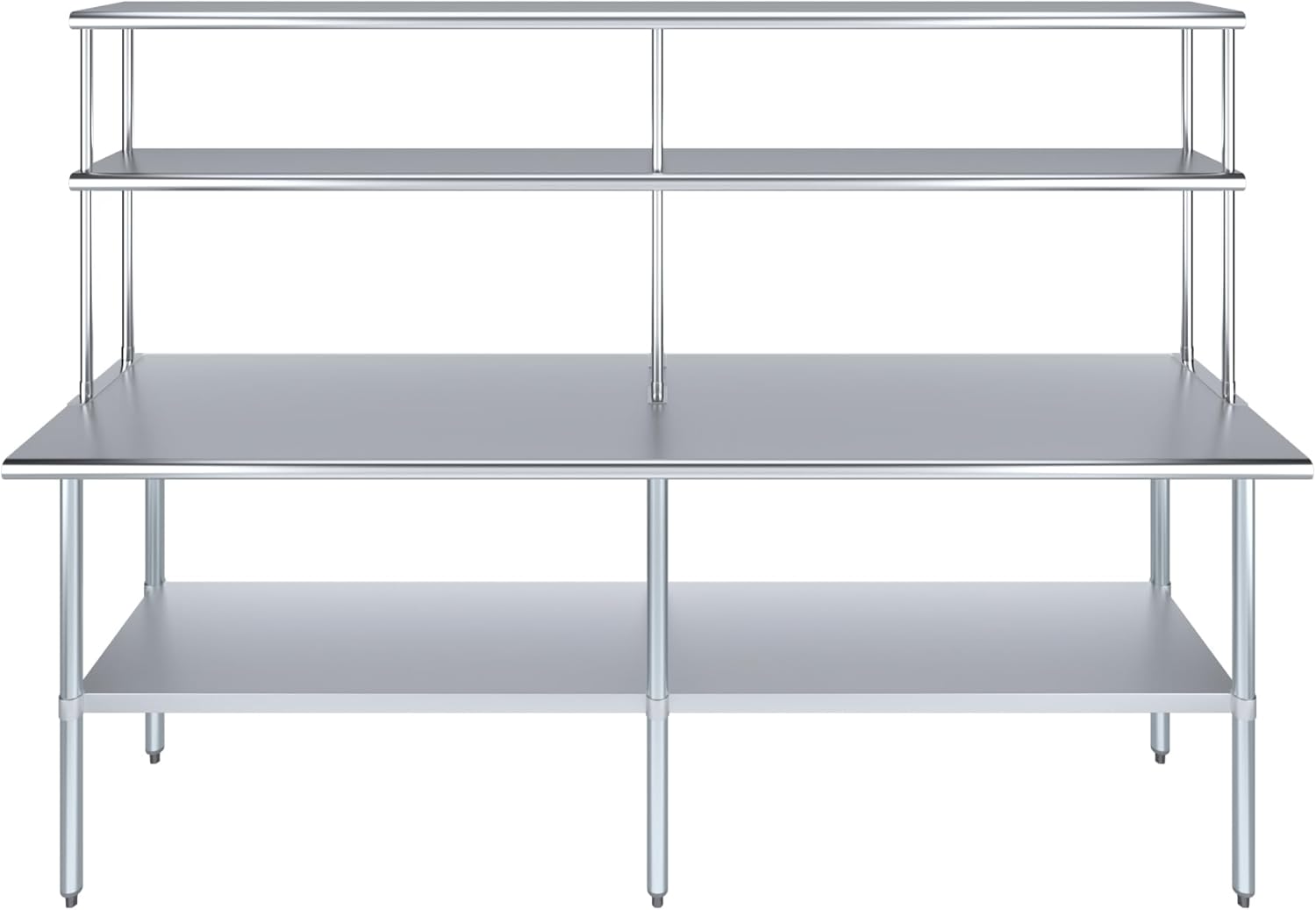 - WORK SAFETY: Work table top and double tier adjustable shelves are constructed from 18-gauge stainless steel, making this restaurant prep and serve table and double tier shelf combo set is durable and long lasting. The table top comes with a galvanized under-shelf for additional storage and adjustable legs for convenience. This table and shelf set is specifically designed and finished for use in a commercial or industrial setting, but is just as reliable in the home.