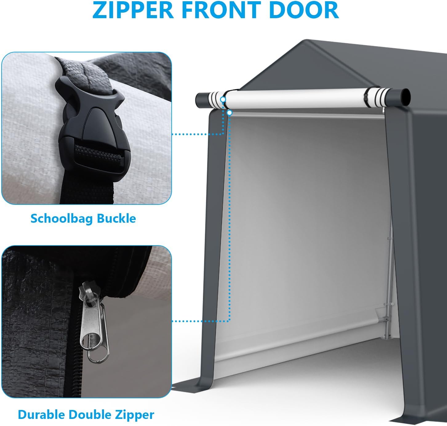 - Sturdy Steel Frame: The whole frame is made from a rust-resistant powder-coated steel frame that prevents chipping, peeling, rust, and corrosion. The solid legs are consists of 1.5inch diameter and 1.2mm Thicken poles, It makes the whole Storage Shelter Carport much safer and more stable.