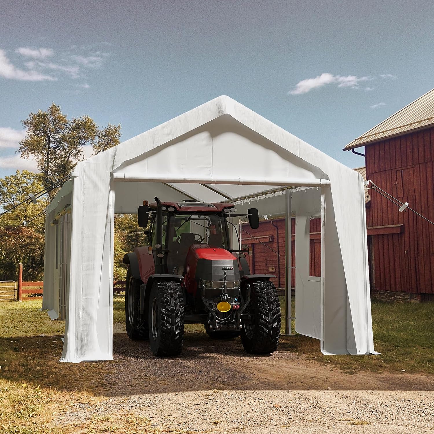 10x20ft Heavy Duty Carport Outdoor Canopy Portable Garage with 4 Doors & 4 Windows Waterproof UV Resistant Storage Shelter with Removable Sidewalls for Car Truck Boat, White
