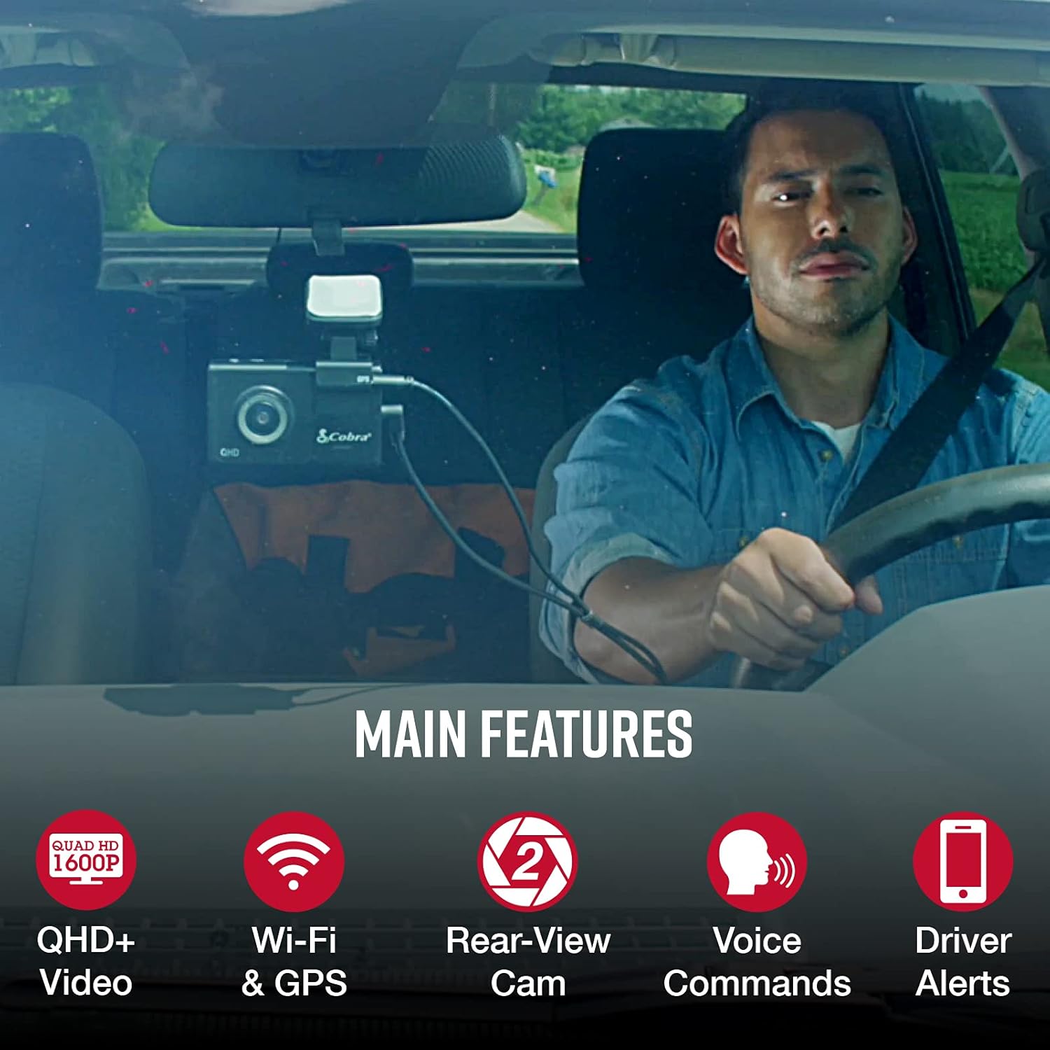 Cobra SC 200D Smart Dash Cam + Rear Cam and 2.5A OBDII Port to Micro-USB Hardwire Kit: Dual-View with QHD+ 1600P Resolution, Built-in Wi-Fi & GPS, Drive Smarter App + Apple Carplay Compatible