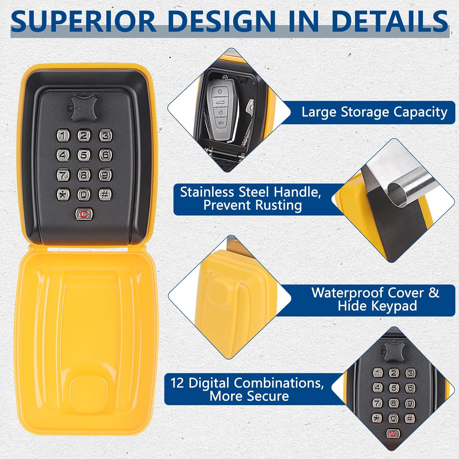 - 【Upgraded Quality Construction】The car window punch button lock box upgrated with a non-scratch pad prevents damage to your car window or other surfaces. The car key lock box features a sturdy solid aluminum alloy body and tough ABS plastic coating, making it durable and long-lasting. It also includes a protective cover to keep the keypad hidden from sight and prevent from any weather conditions.
