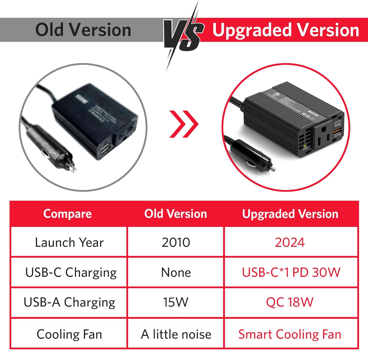 - 【BESTEK Advantage & Multiple Outlets】BESTEK America's #1 power inverter brand. The 150W Power Inverter features 1 AC outlet and 2 USB ports,1 USB-C port (PD 30W), and 1 USB-A port (QC 18W), Provides 150W continuous DC to AC power and 250W watts of peak power, allowing you to charge multiple devices simultaneously, making it ideal for use in driving, road trips, In-car office, or while camping.
