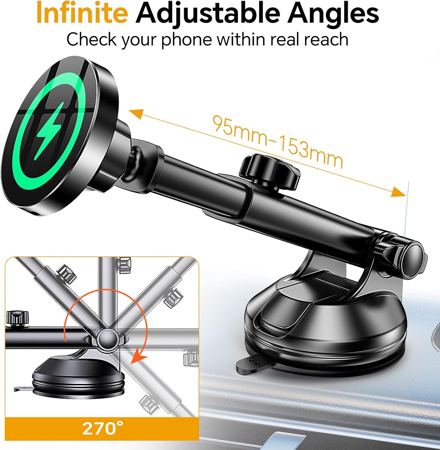 - 【𝐀𝐝𝐣𝐮𝐬𝐭 𝐂𝐚𝐫 𝐇𝐨𝐥𝐝𝐞𝐫 𝐌𝐨𝐮𝐧𝐭 𝐀𝐬 𝐘𝐨𝐮 𝐖𝐢𝐬𝐡 】: The ball joint and arm of this phone mount for car wireless charger are 10 x sturdier than normal ones. Adjustable 270° Telescopic Arm/360° Rotation Ball Joint/Extendable Arm, allow you to rotate your phone to landscape or portrait and adjust your phone to a position angle that meets your need. During driving, you can adjust this magsafe car phone charger according to your front.