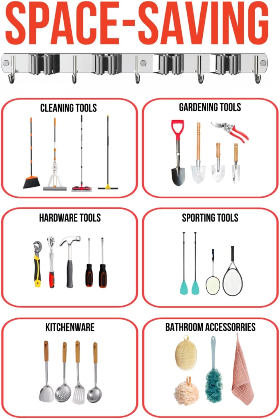 - SAVE SPACE: The wall hangers for brooms and mops provides you easy access to store and grab brooms, dustpans, mops. This tool organizer with 5 gripers and 4 utility hooks allows you to hold brooms, mops, brushes, rakes, garden tools, etc
