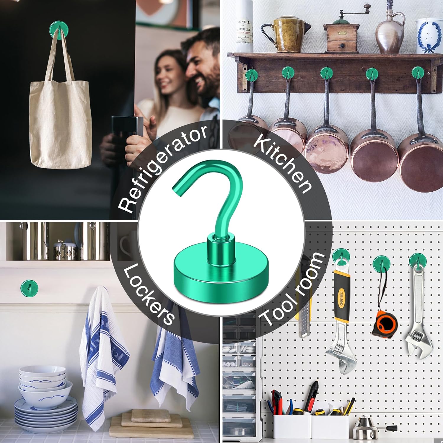 MIKEDE Magnetic Hooks Heavy Duty, 80LB Strong Magnet with Hook for Fridge, Super Neodymium Extra Strength Industrial Hooks for Hanging, Magnetic Hanger for Toolbox, Cruise, Grill(Green,4 Pack)