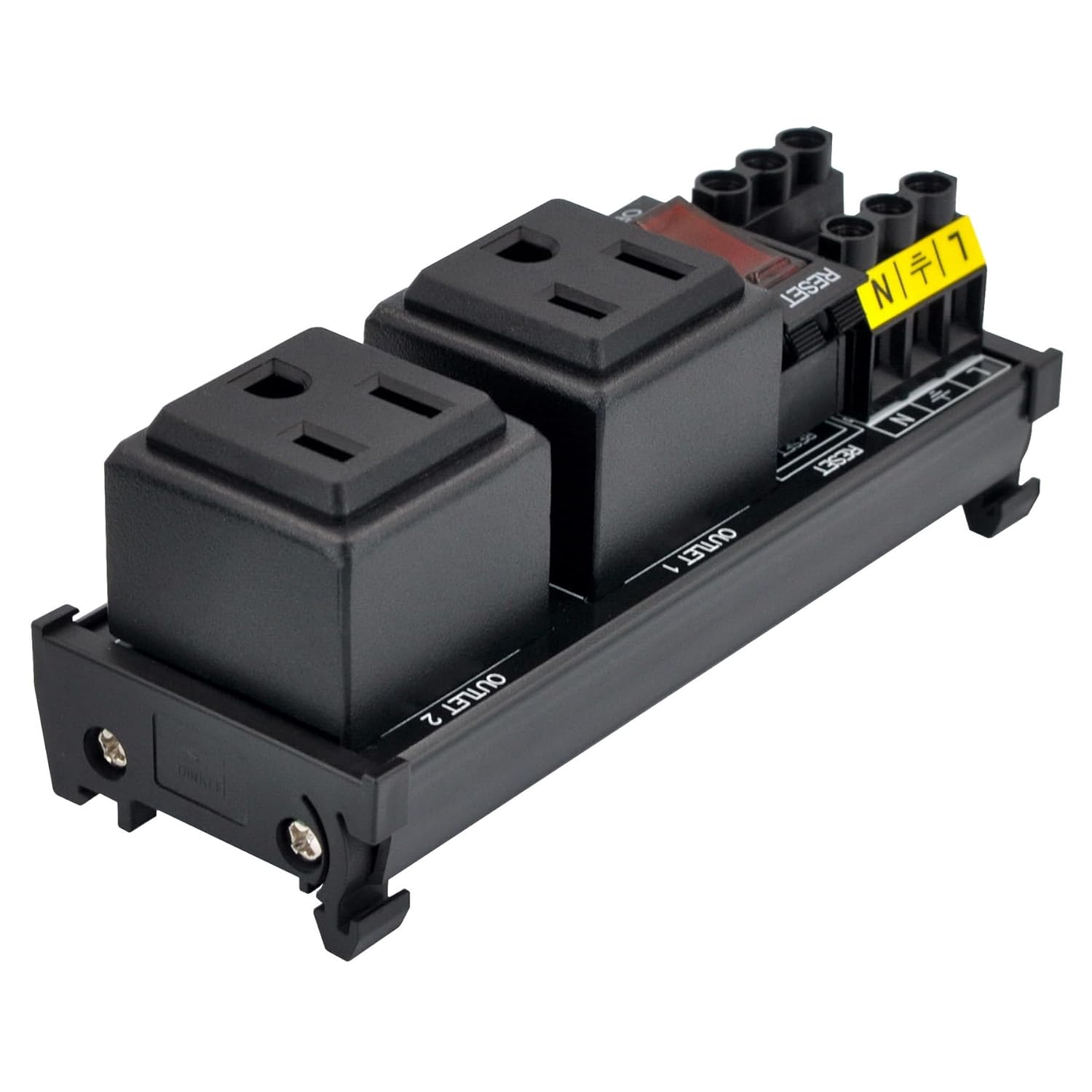 DIN Rail Mount AC 120V NEMA 5-15R Double Receptacles Outlet Power Strip Module, with Rocker Switch Thermal Circuit Breaker Overload Protector