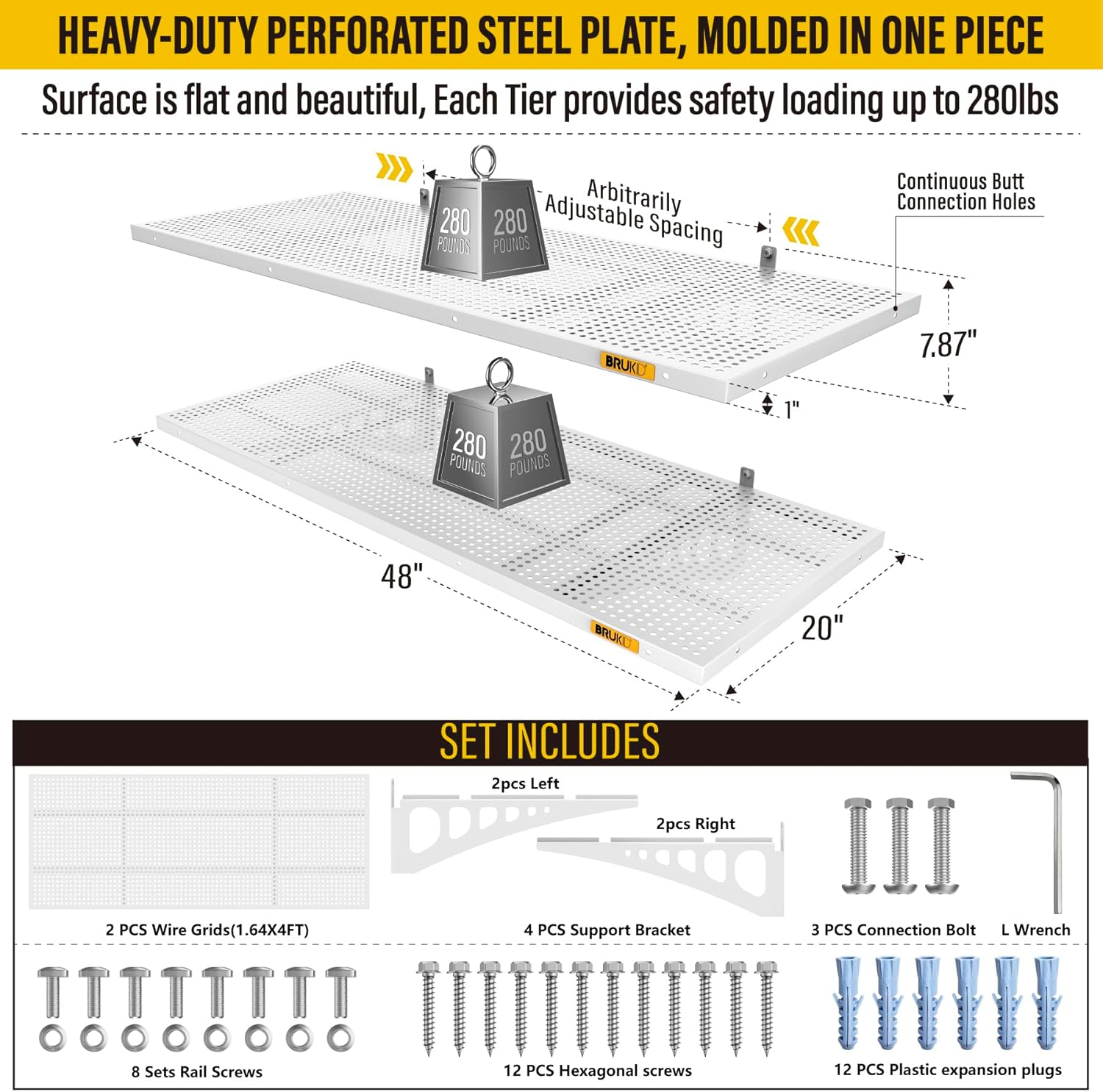 - SUPERIOR DESIGN: Wall shelf garage storage rack panel is made of whole piece of perforated steel plate bending and welding, the surface of matte high temperature powder baking paint, flat and smooth; the panel adopts slide rail design, can be adjusted by parallel left and right sliding at will; bracket can be freely installed in 45β range of the spacing of the wood wall keel, without affecting the precision connection with the panel, eliminating the worry of being unable to docking due to the mismatch of spacing points of load-bearing wood wall keel or inaccuracy of the installation of the bracket. It saves time and labor