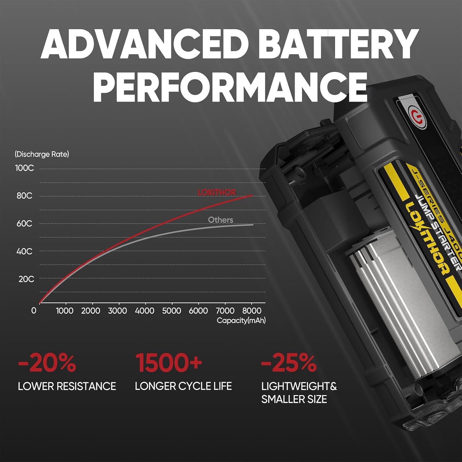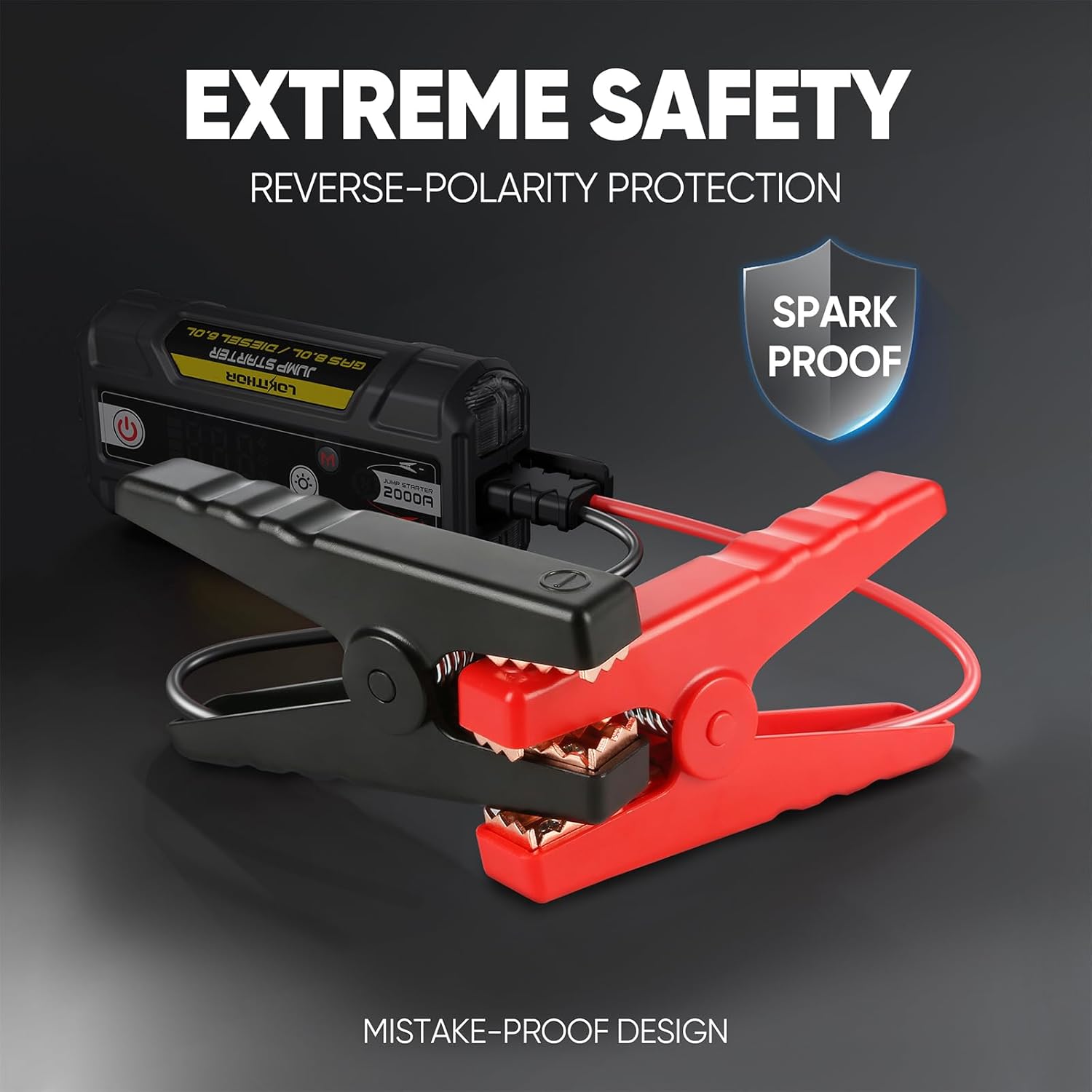 - Extreme Safe - Designed with an integrated battery management system and smart self-identifying clip, the LOKITHOR emergency starter is safe and fully insulated. 10 protection types, including Spark-Proof Protection, Reverse-Charge Protection, Over-Charge Protection, Over-Current Protection, Short-Circuit Protection, Reverse-Polarity Protection, Low-Temp Protection, High-Temp Protection, Over-Voltage Protection , Over-Load Protection, securely connects to any 12-volt vehicle.