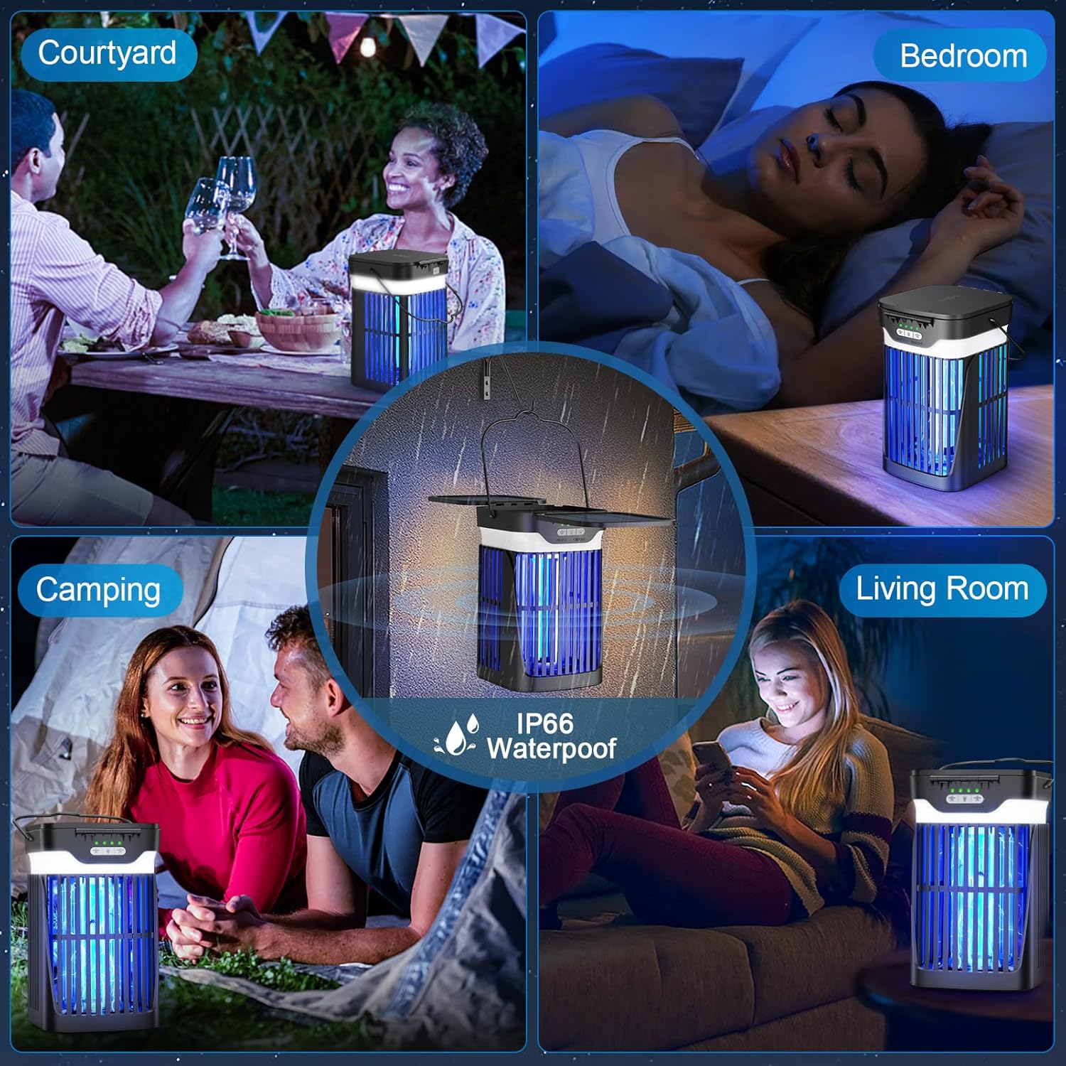 - Dual Folding Solar Panels and USB Charging: The bug mosquito zapper lamp can be charged via solar power or USB, including two high-capacity charging panels that also fold. Once fully charged, the accompanying LED lamp works for up to 10-12 hours, and the insect-killer lamp for up to 9-15 hours. This design effectively keeps your home mosquito-free for longer periods, reducing the need for frequent recharging. Additionally, IP66 waterproof rating makes it very suitable for outdoor use.