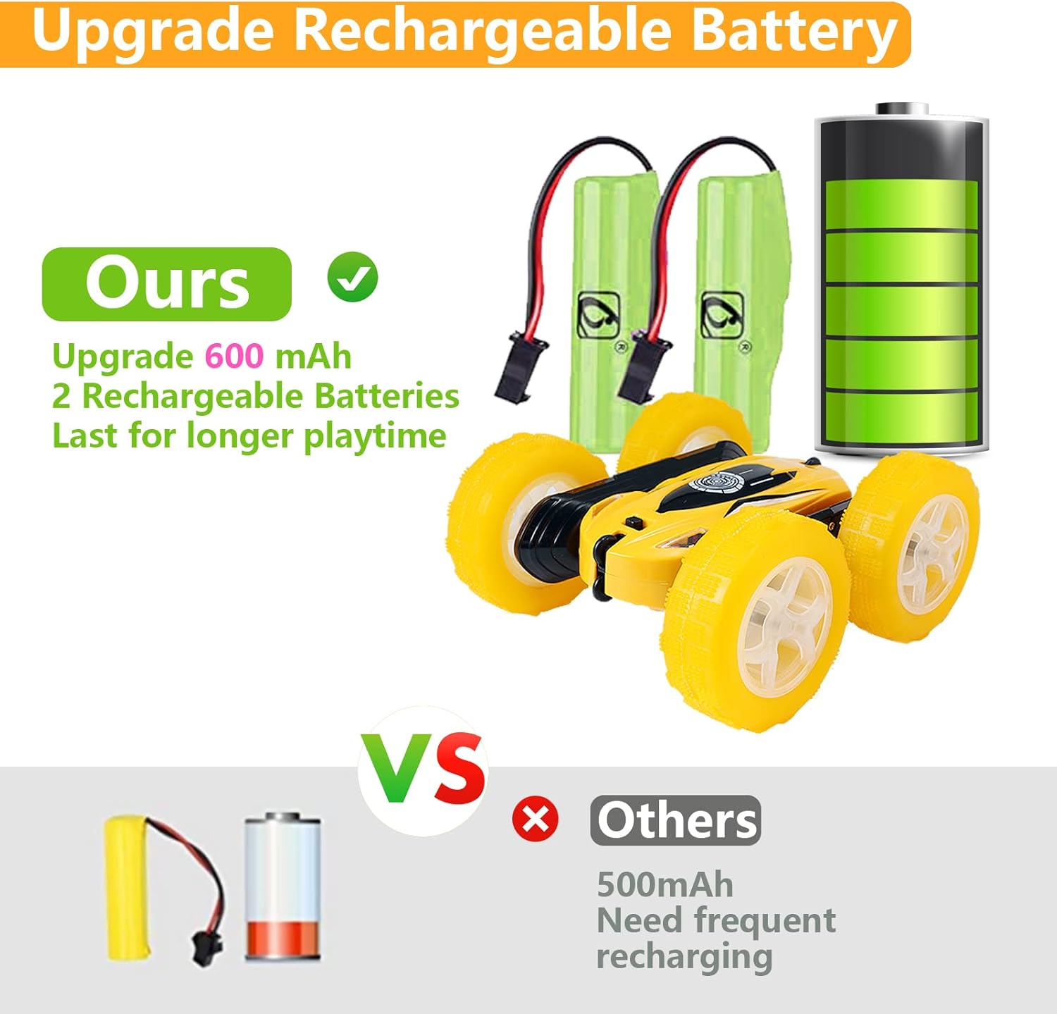 - 360° Rotating Stunts: The RC car can perform a variety of stunts, including running, moving forward and backward, turning right and left, rolling, and rotating 360 degrees. It can also drive on both sides, allowing for different playing experiences and the ability to pass obstacles easily.