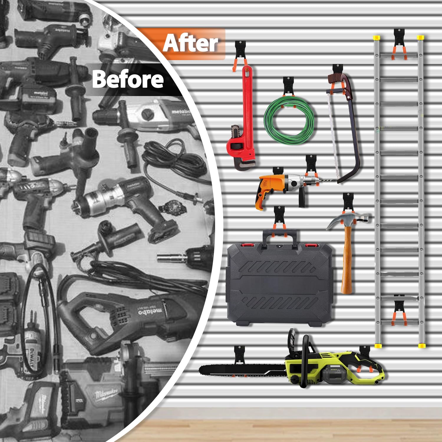 - Easy to Install and Space Saving: slat wall hooks fit standard slat wall like Proslat, Handiwall, Crownwall, etc., you can directly place slat wall hanging hooks to both sides of the panel groove, fix garage hooks for hanging into the groove on the panel then press slatwall brackets down and ladder hook will fit perfectly. Then you can move garage hooks to anywhere you want to put, saving you time and effort