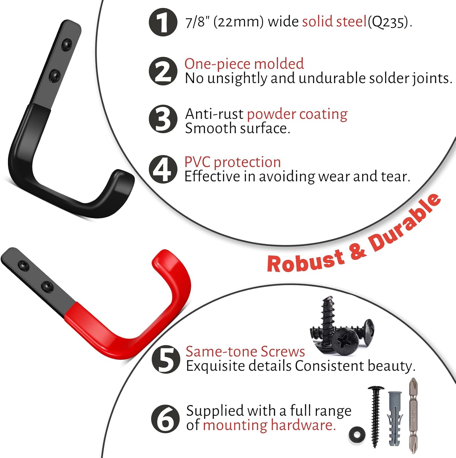 - EASY INSTALLATION: The garage wall hooks design is simple, allowing for quick and easy installation. It comes with detailed installation instructions and all the necessary mounting hardware, making it easy to install without requiring any professional skills.