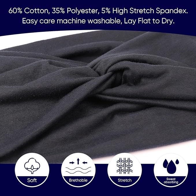 - Premium Material: Women's hairbands are made of cotton, polyester and high-stretch spandex, making them soft and skin-friendly, with excellent performance in water absorption, sweat absorption, durability and abrasion resistance, allowing you to wear them all day long without getting a headache.
