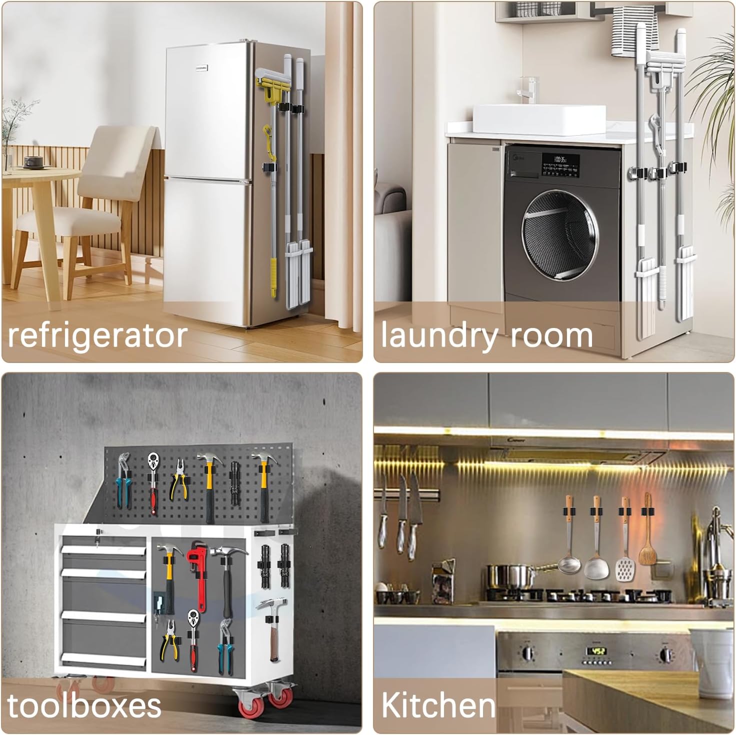 - π§²[EASY TO INSTALL] Without drilling holes, the magnetic broom holder can attach to any metallic surface to secure mops, brooms, flashlights, spray cans, markers, and other small garage tools in place, and easily move it around when using, much handy for daily life.