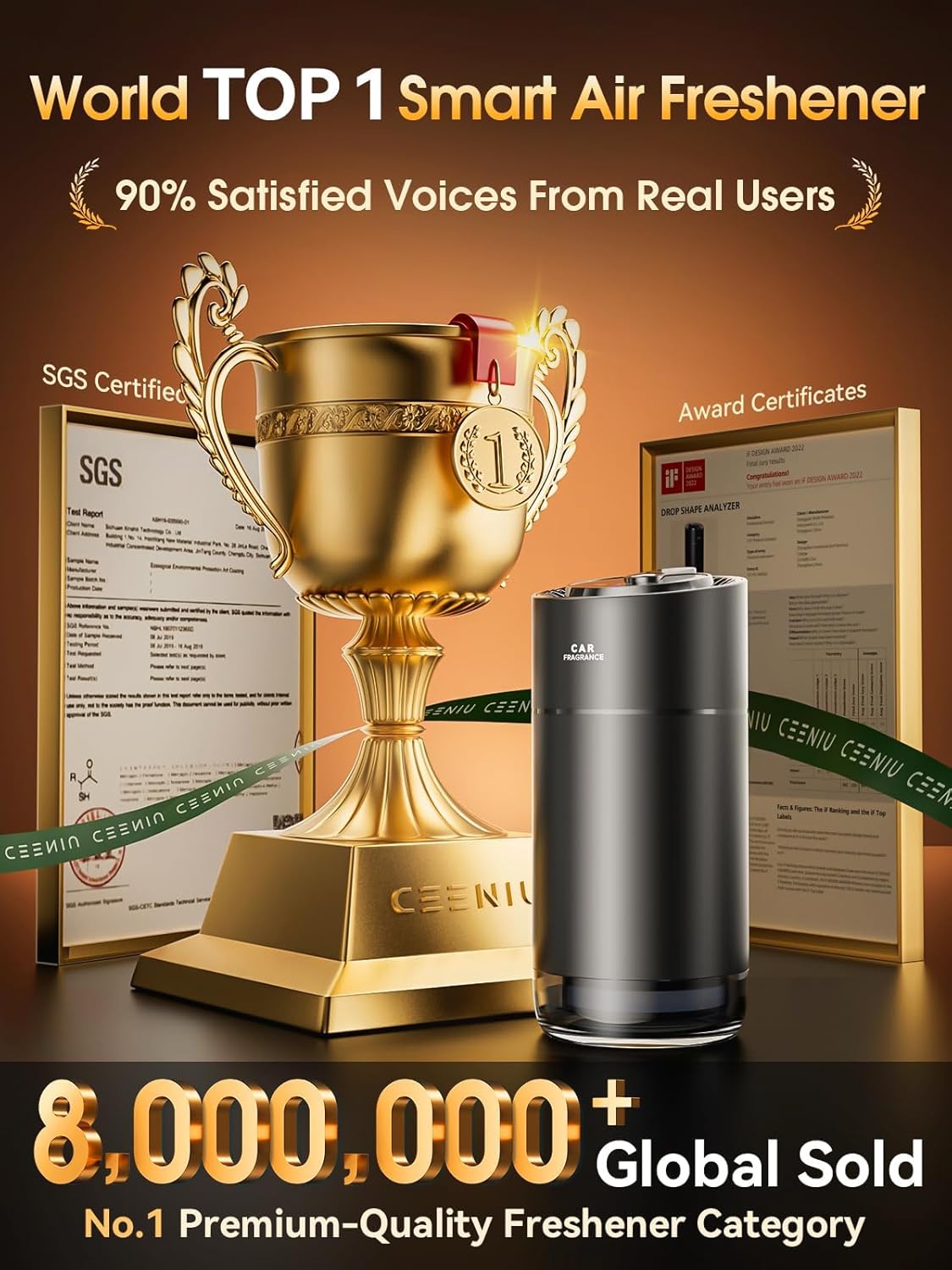 Ceeniu Smart Car Air Fresheners, New Smell Experience By Ultrasonic mist, Auto On/Off, Natural Fragrance Lasts for 4 Months, Adjustable, Built-in Battery Car freshener