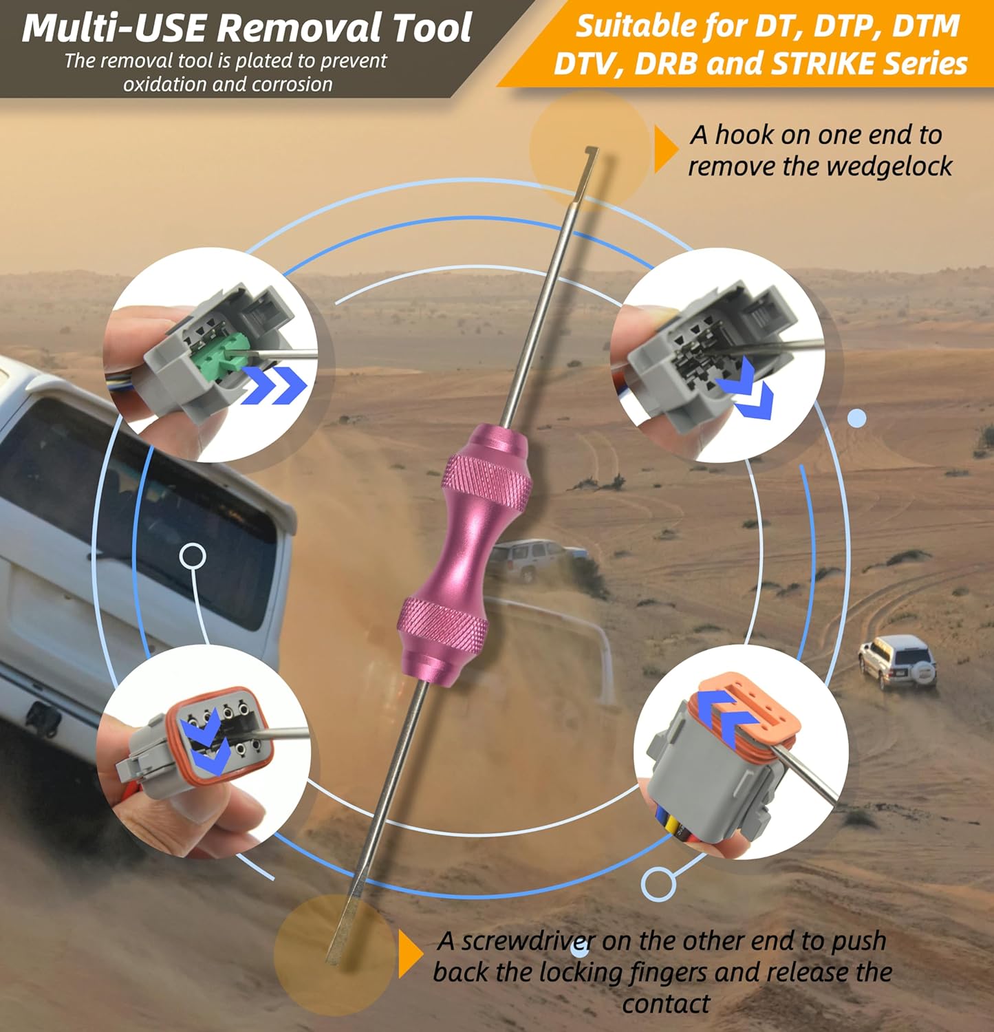 - Professional Tools: Professional 4-way indent crimping tool for 12-20AWG Wire, smooth ratchet for accurate and consistent crimps.The Removal Tool can be used to remove wedgleocks and also release pins and sockets on several Deutsch series connectors. Compatible with DT, DTM, DTP, DRB, DTV, and STRIKE Series.