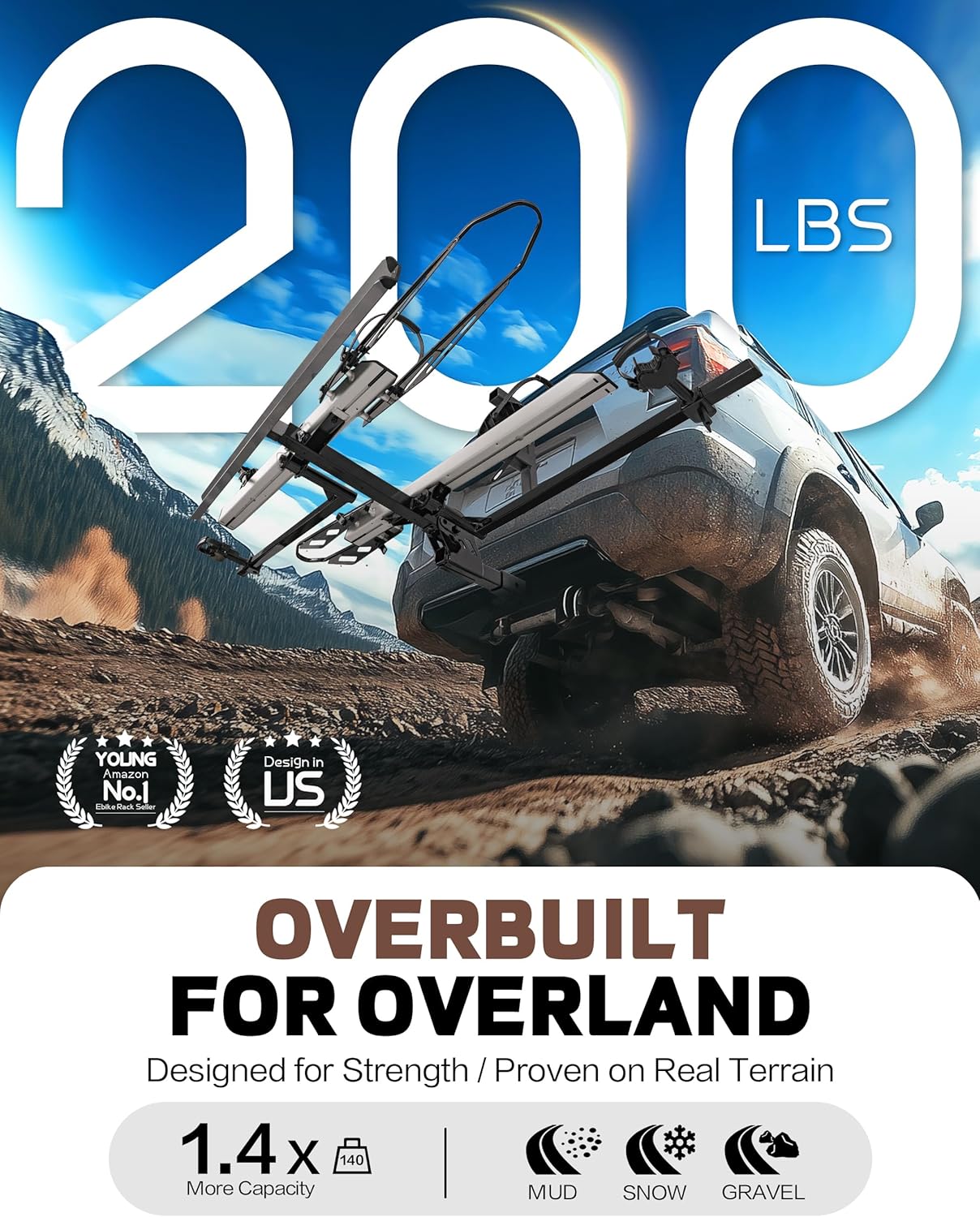 - DURABLE and SAFE: Young Electric bike rack is constructed with reinforced steel and aluminum which makes it durable and powerful enough to carry 2 bikes weighing 100 lbs each. Comes with 2-arm fix, patent secure wheel cradles and anti-wobble structure, that secure your E-bikes in place without swaying and knocking against vehicle.