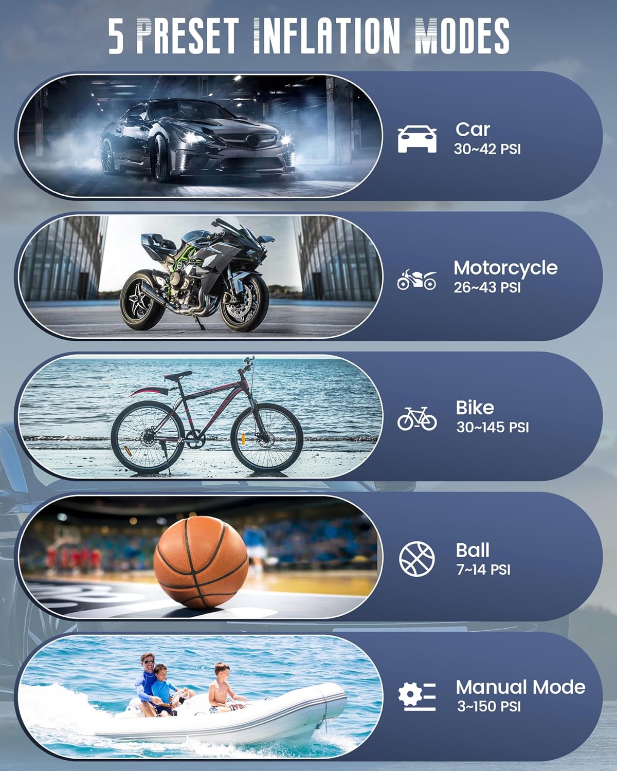 - π[SMART INFLATION & REAL-TIME PRESSURE MONITORING]: The tire pump is equipped with a large LCD, and uses a new generation of high-precision sensors and dual LCD to show real-time and preset pressure values with an accuracy of Β±0.5 psi. 4 preset inflation modes for inflating bicycles, motorbikes, cars and balls, automatically stops when the preset value is reached. the manual mode allows you to set the pressure value on demand. 4 units to choose, PSIγKPAγBARγKG/CMΒ²