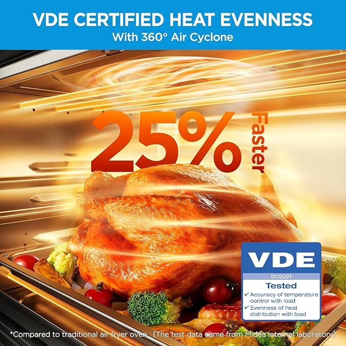 - Cyclone Air Fryer: Enjoy 25% faster cooking and 90% less oil compared to traditional fryers, . This all-in-one combo features VDE-certified heat evenness with one convection fan and six heat tubes, allowing it to heat up quickly and eliminate the need for preheating when using the air fry function.