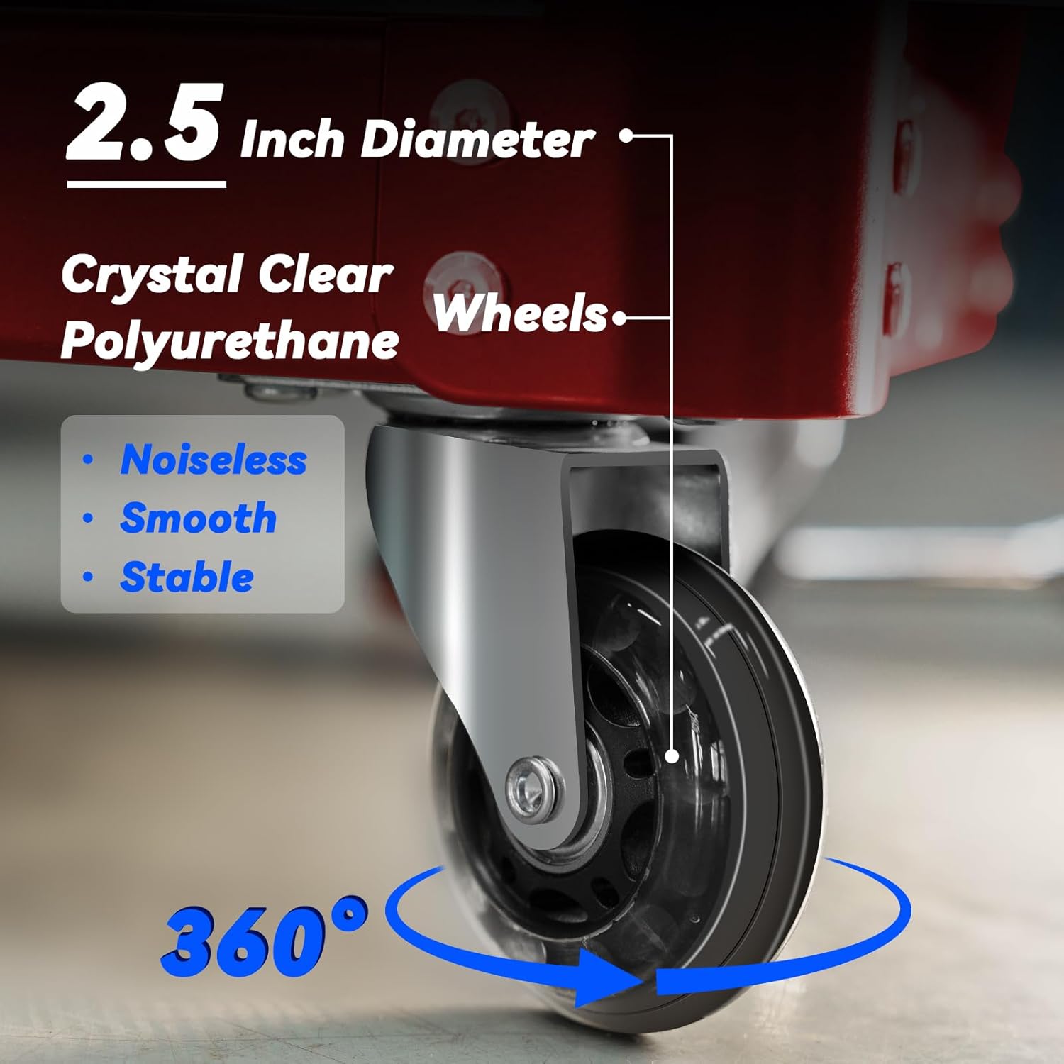 - 【360°& 330 LBS】Equipped with 4 pcs sturdy 2.5"/6.35cm 360° swivel casters. Smooth rolling stool wheels for easily moving around on various floor even on complex surfaces. The heavy duty mechanic creeper is specially designed with a thick angle steel frame for long-lasting performance and reliability. Its design can withstand heavy use, with an overall weight capacity of around 330 pounds. It is a sturdy and practical choice for use in garages, workshops and other places