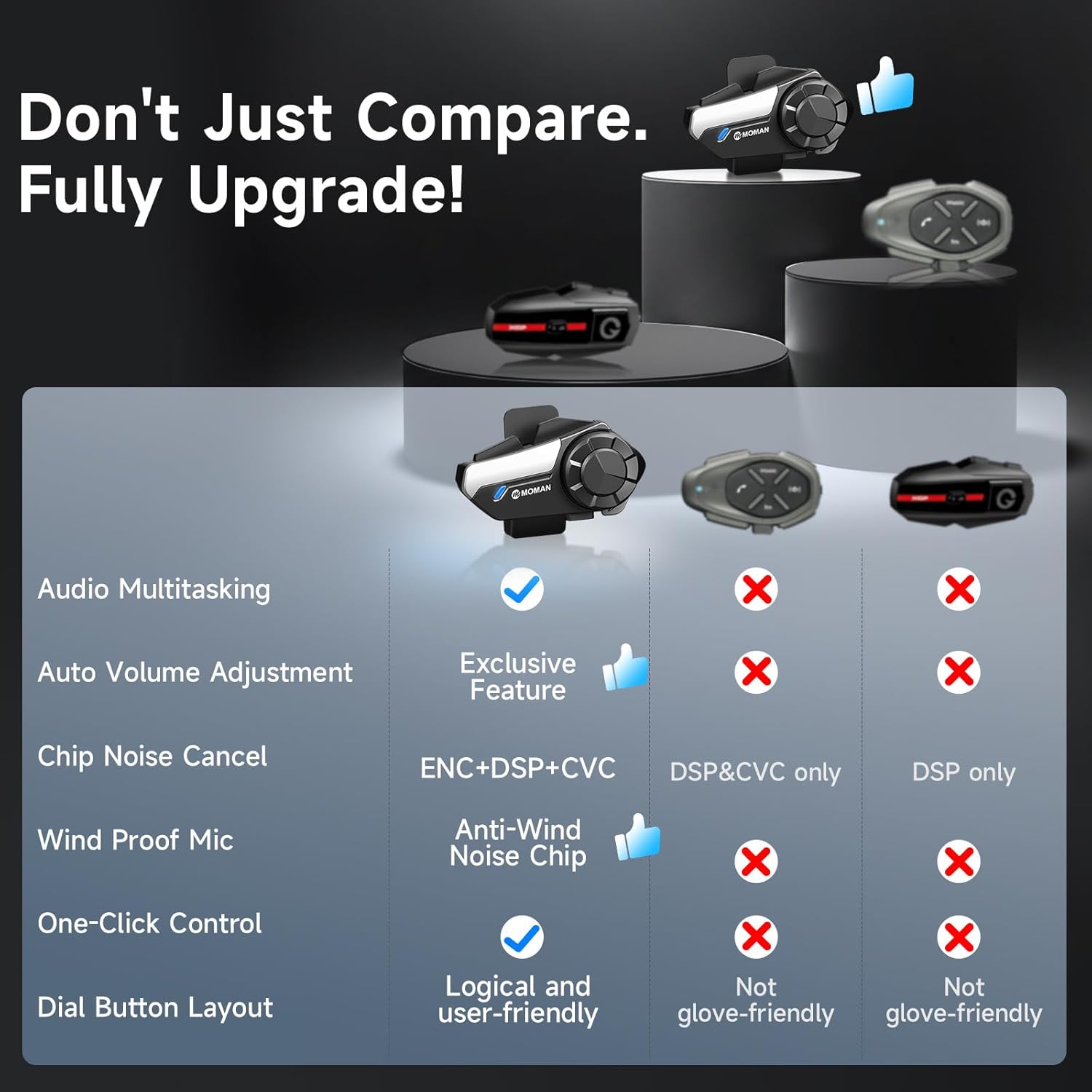 - 【Connection Upgrade–Faster & More Stable】Moman H2S motorcycle intercom features the latest dual-version BT5.3 and 5.1 chips, delivering 60% faster pairing efficiency, 40% improved connection stability, and a transmission range of up to 1000 meters with automatic 10-second reconnection. Enjoy seamless, near-zero-latency performance for rider-to-rider intercom, music streaming, radio, or GPS navigation - completely free from disconnection issues.