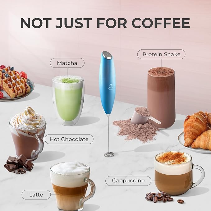 Zulay Kitchen Milk Frother Wand - Handheld Electric Coffee Frother (2 Duracell Batteries Included) - Easy-Clean Wand & Drink Mixer - Metallic Blue