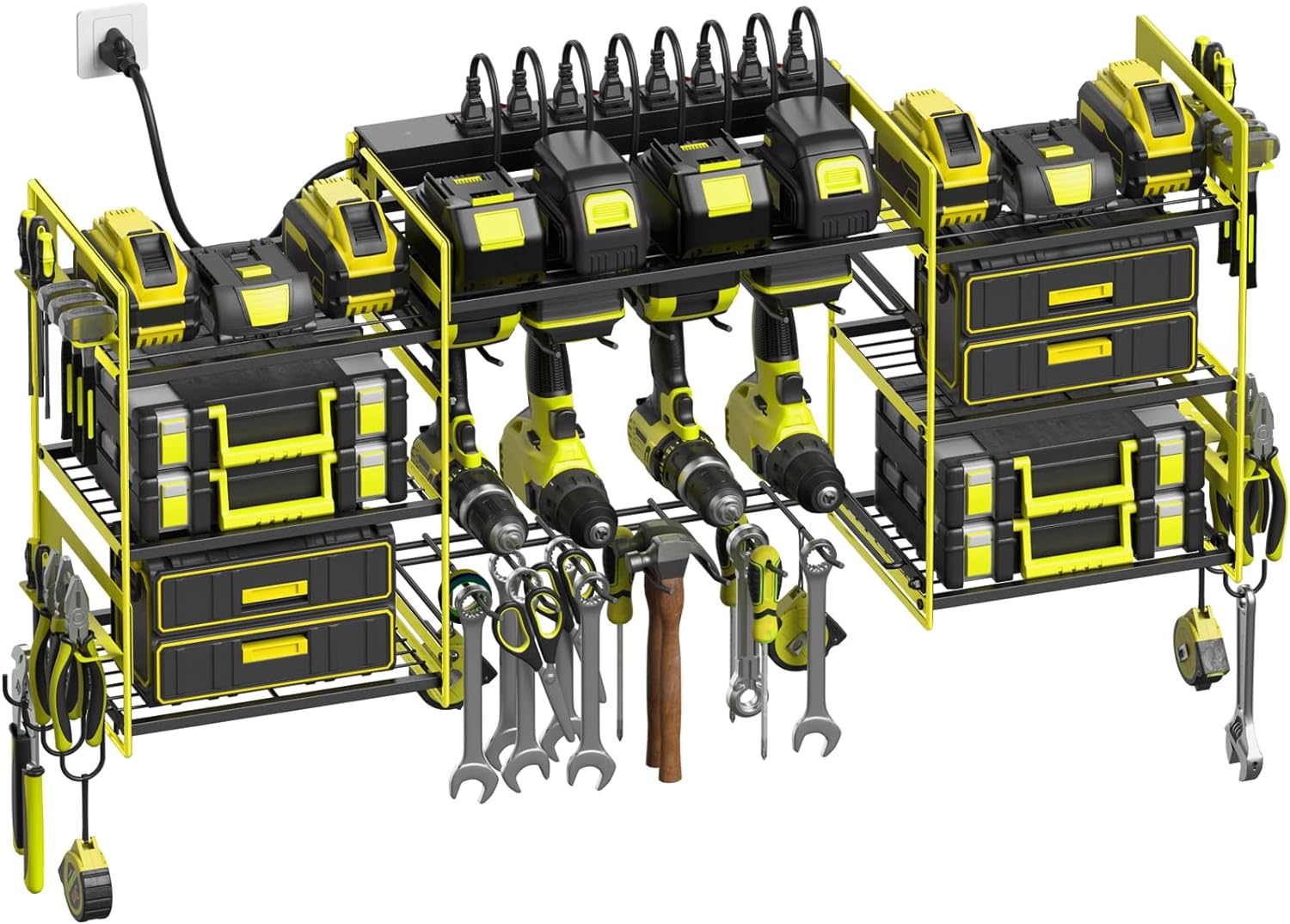 - Very convenient for charging your tool batteries, tools rack built-in metal 8 outlets with separate switch, avoids the hassle of unplugging and unplugging repeatedly. with surge protection of 1200J, Able to protect your device to a certain extent. Utility rack size: L:38.8in * W:9.4in * H:16.5in. Can be mounted on wall.