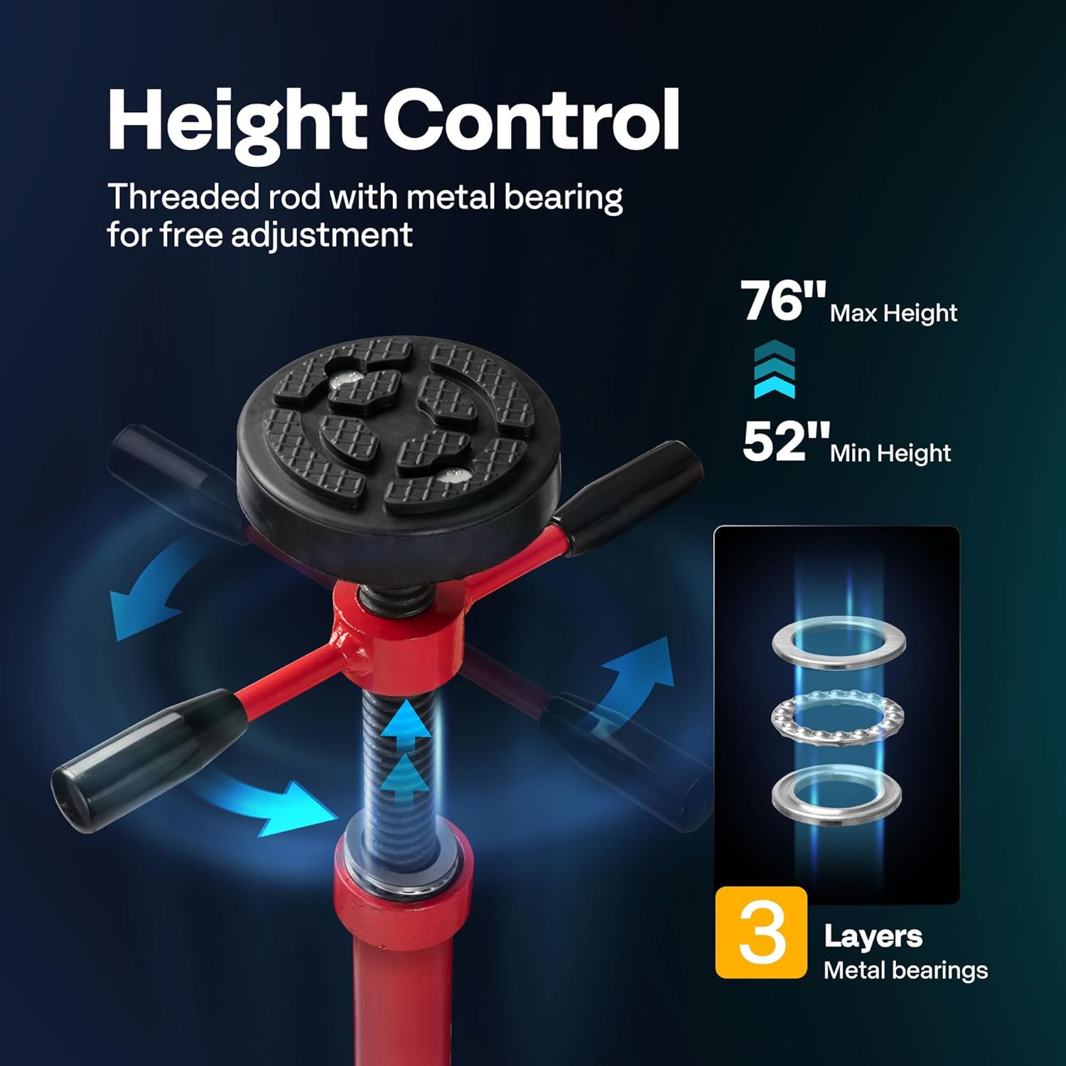 - ADJUSTABLE HEIGHT - The threaded rod enables you to adjust the position from 52 to 76 inches based on your specific requirements; The threaded rod also features a self-locking function to prevent the stand from lowering without assistance, avoid any damage on users or cars; The foot pedal on the bottom bracket allows users to adjust the height for precise adjustment