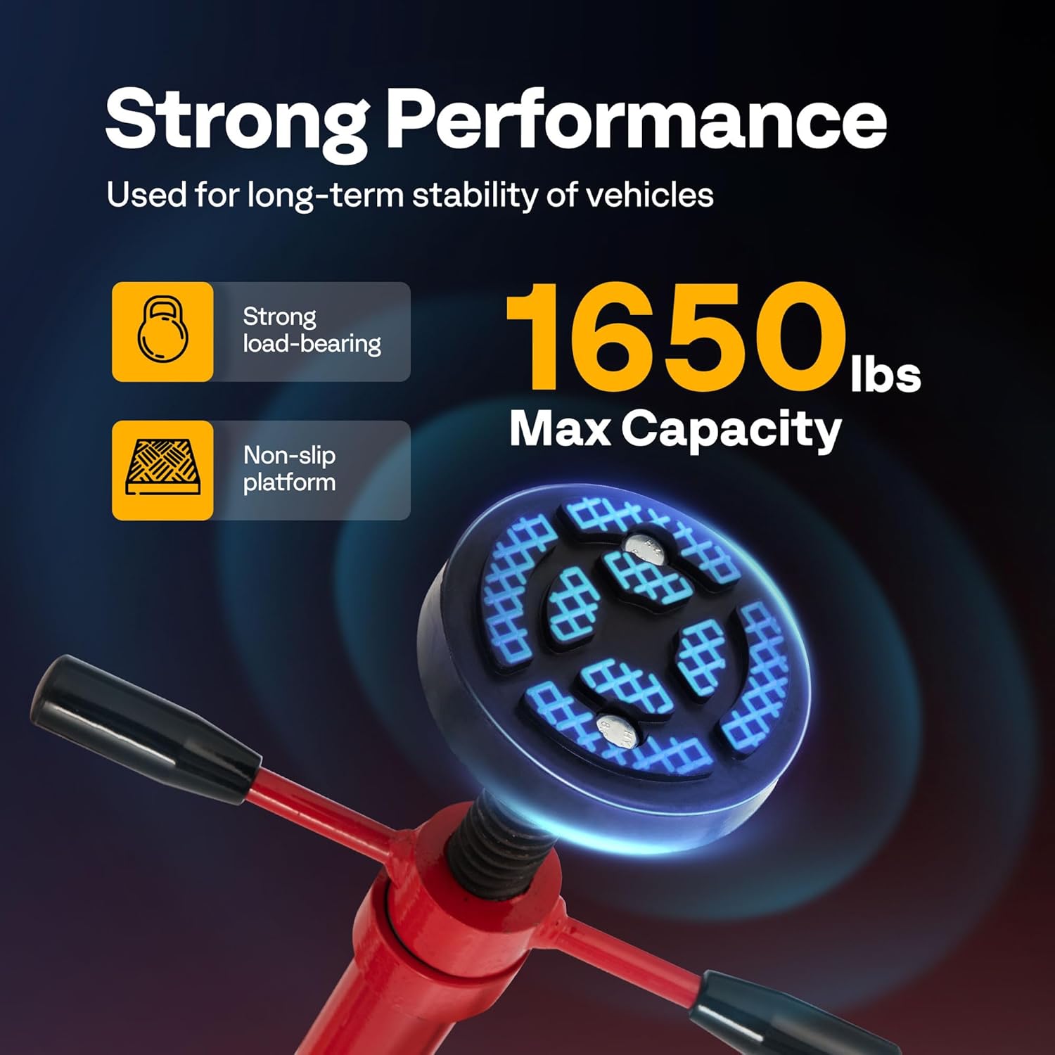 - IMPRESSIVE PERFORMANCE - This SPECSTAR underhoist support stand is capable of supporting up to 1650 lbs, making it an ideal tool for supporting or positioning vehicle components, exhaust system installations, and shock absorber replacement; Crafted from high-quality steel, this jack stand offers exceptional strength and durability, ensuring that it is built to last and resistant to deformation or twisting even under considerable pressure