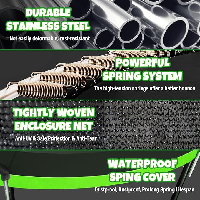 - 【Sturdy & Weatherproof】Built with galvanized stainless steel frames, our outdoor trampolines ensure durability, weather resistance, and rust prevention. Supported by four evenly spaced W-shaped legs, our trampoline provides exceptional stability and support.
