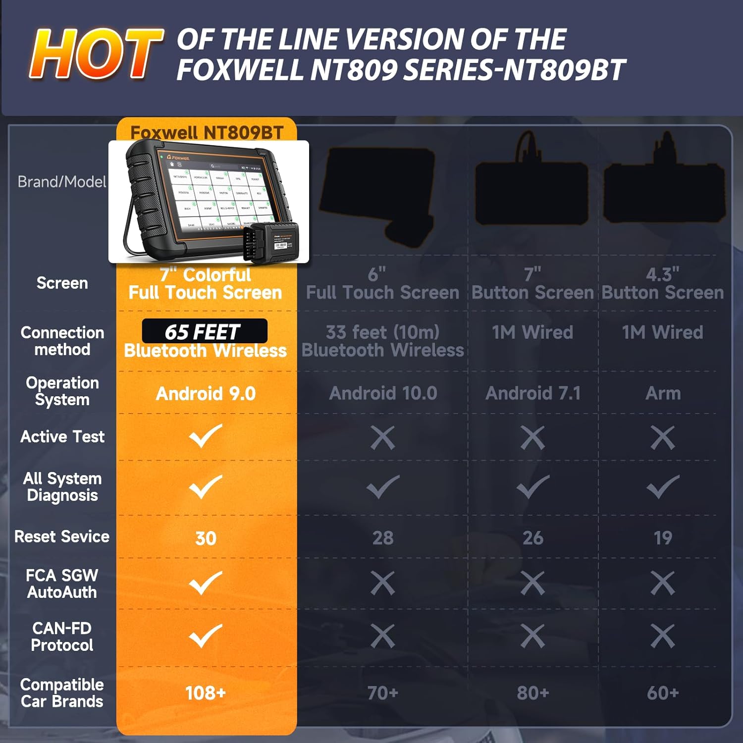 - 【Why NT809BT?】🔥30+ special functions for all-system diagnosis, code ops & 99% active tests.🔥Works for vehicles across regions & languages.🔥Wireless VCI, 7" smooth touch screen, non-slip shell + bracket.🔥1-yr aftersales, 3-yr free upgrades, lifetime tech support.🔥Cost-effective, merges functions of FOXWELL NT301/201, NT604, NT614, NT624, NT630/650, NT706, NT716, NT726, NT809. Whether you're an automaker, repair-shop mechanic, DIY-fixing homemaker, or DIYer, NT809BT is a top pick.