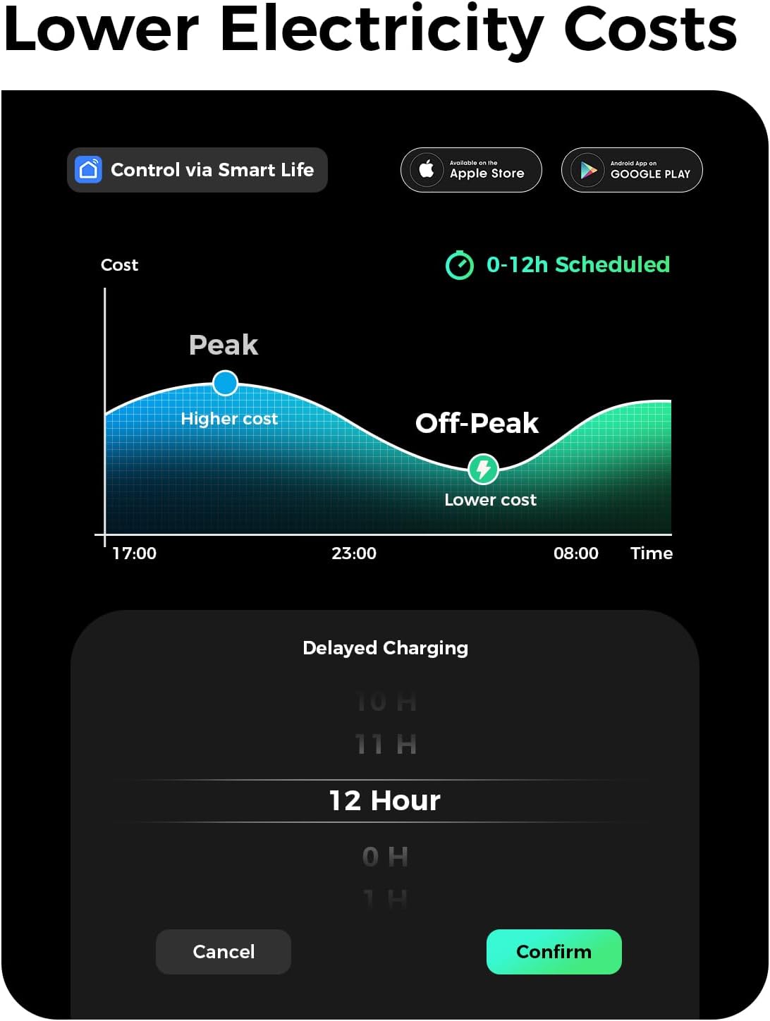 - 0-12 hours Scheduled: The EV charger level 2 supports a maximum current of 48A, compatible with NEMA 14-60 plug. The smart Level 2 EV Charger supports a scheduled charging function, allowing you- to charge during off-peak hours when electricity rates are lower, thus saving on charging costs. Additionally, it helps you avoid peak charging times, enhancing charging efficiency. This provides your electric vehicle with a more economical and convenient charging solution.