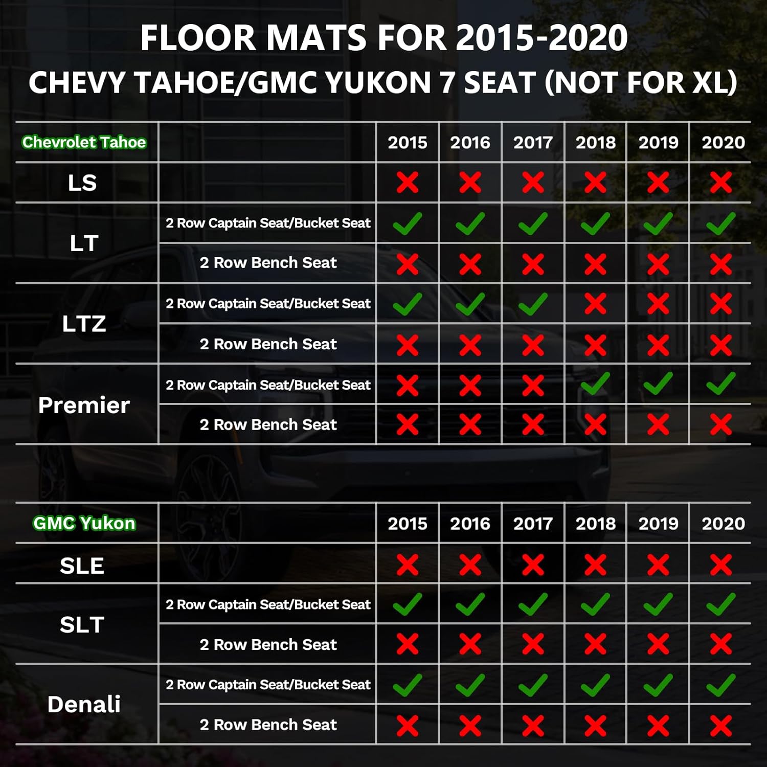 - 【All Weather Protection】ANBINGO all weather car floor mats for 2015-2020 Chevy Tahoe/GMC Yukon are suitable for all kinds of harsh conditions, and are still elastic under conditions of -58°F, Not Crack and Deform. The floor mats adopts a high lip design, which can effectively block pollutants such as rain and snow, sewage, sediment ,and keep the car interior clean